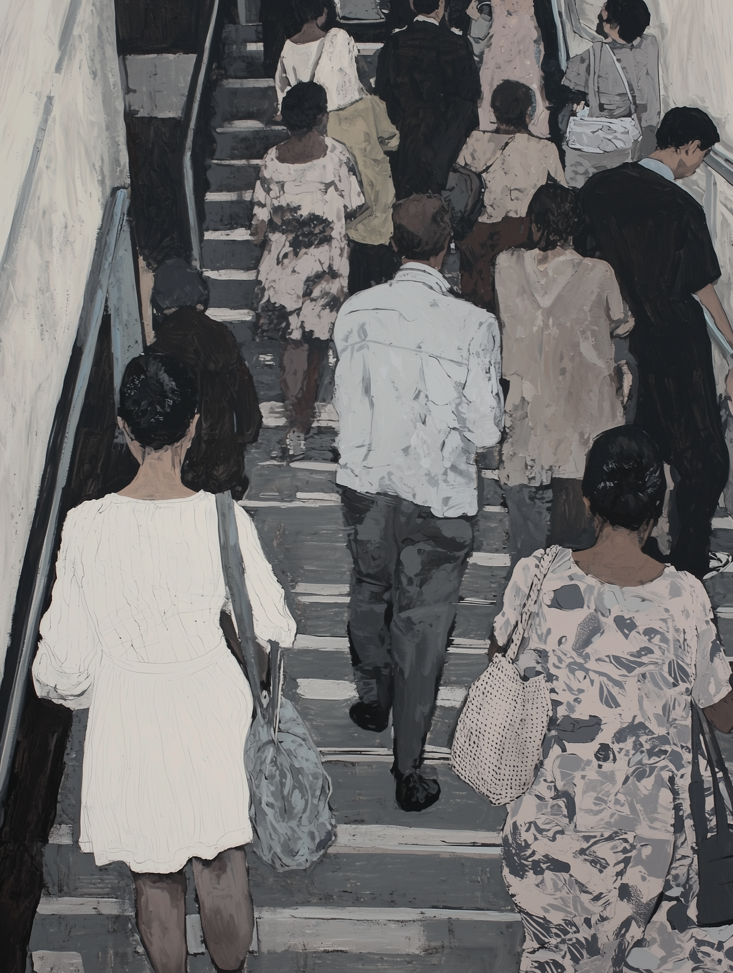 A muted painting of people ascending stairs in an urban setting, showcasing diverse clothing styles and a reflective, somber tone.
