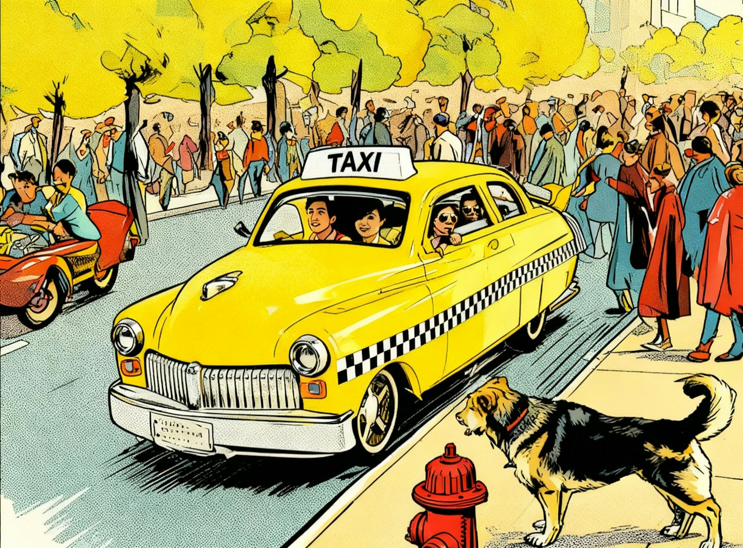 A lively illustration of a yellow taxi on a busy street, surrounded by pedestrians and a dog near a fire hydrant, capturing urban vibrancy.