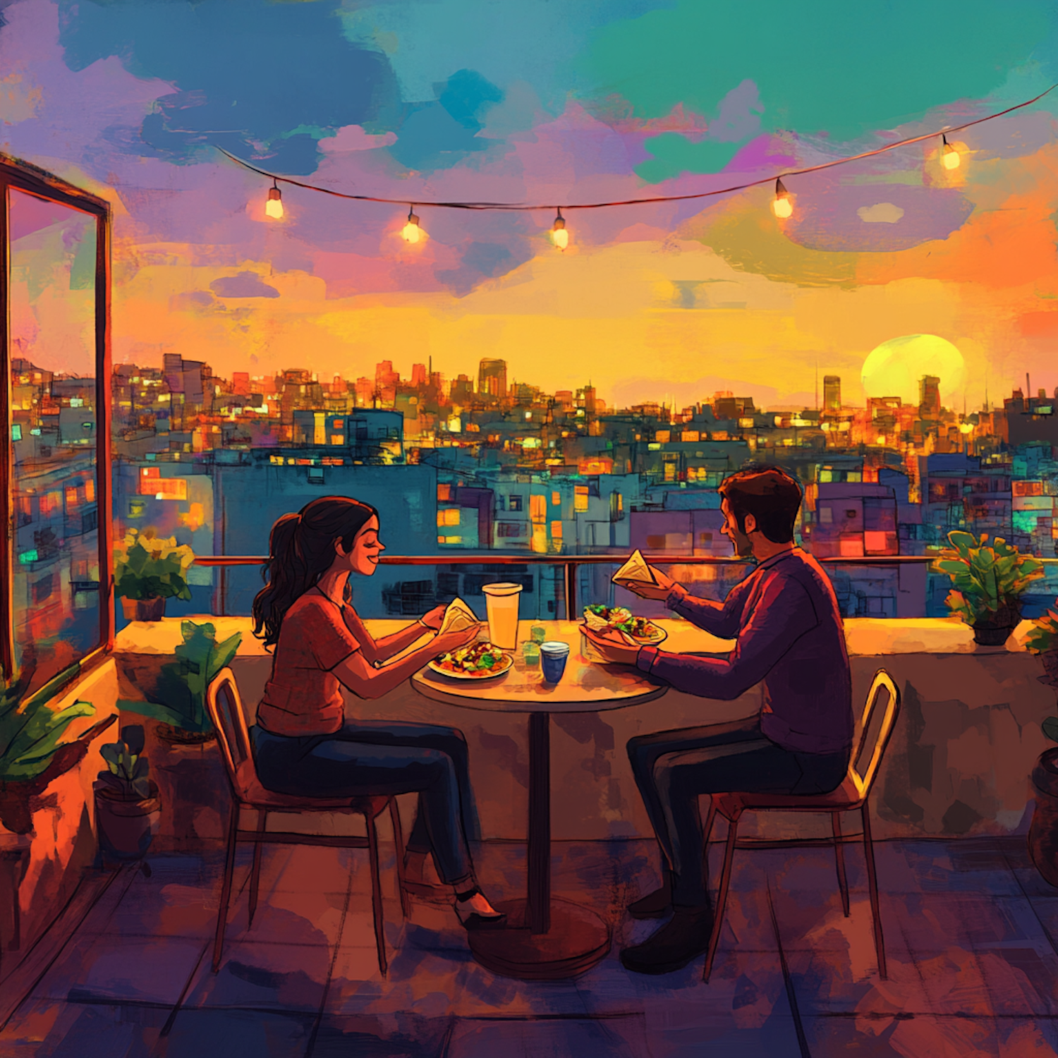 Romantic rooftop dinner with a couple enjoying a meal under string lights, set against a vibrant sunset cityscape.