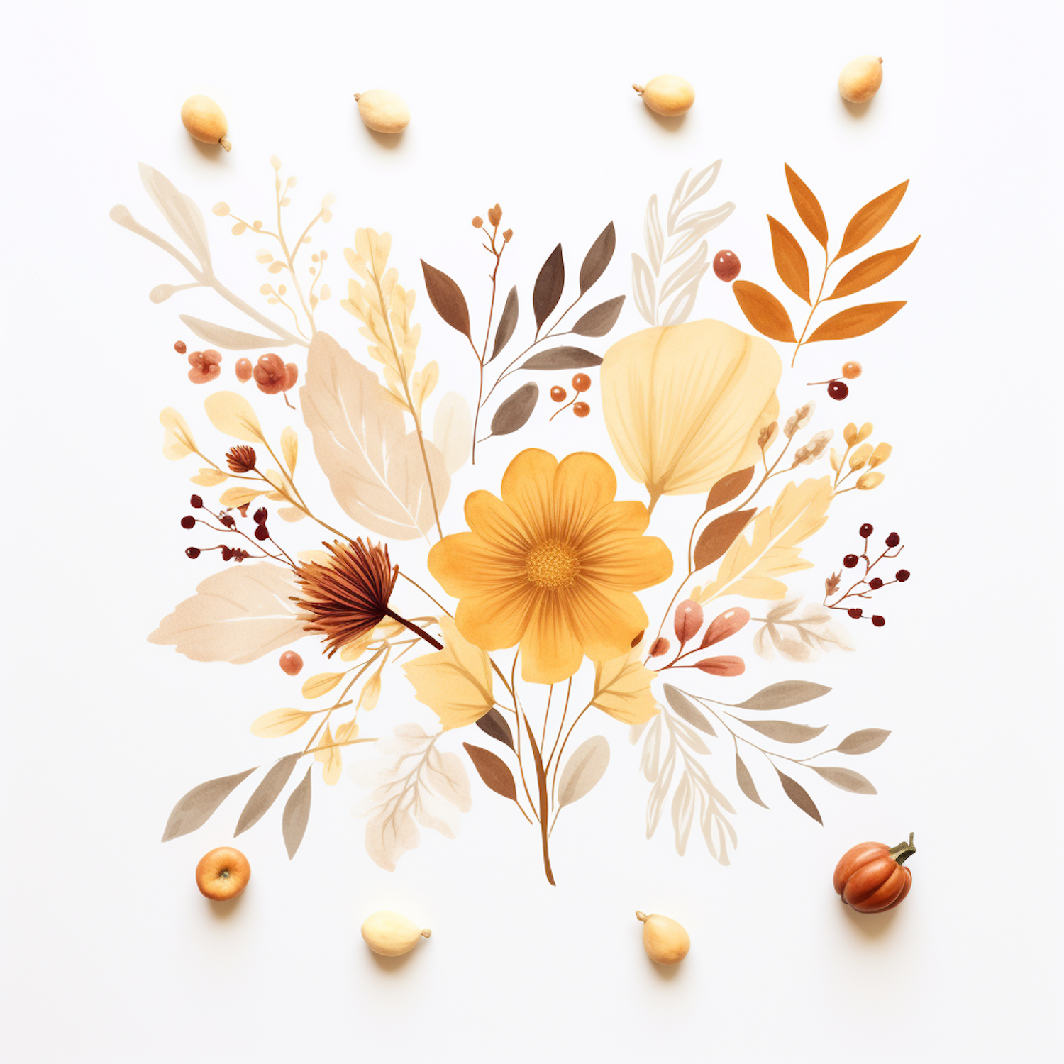 Autumn-themed illustration with vibrant flowers, leaves, and small pumpkins on a white background, capturing the essence of fall.