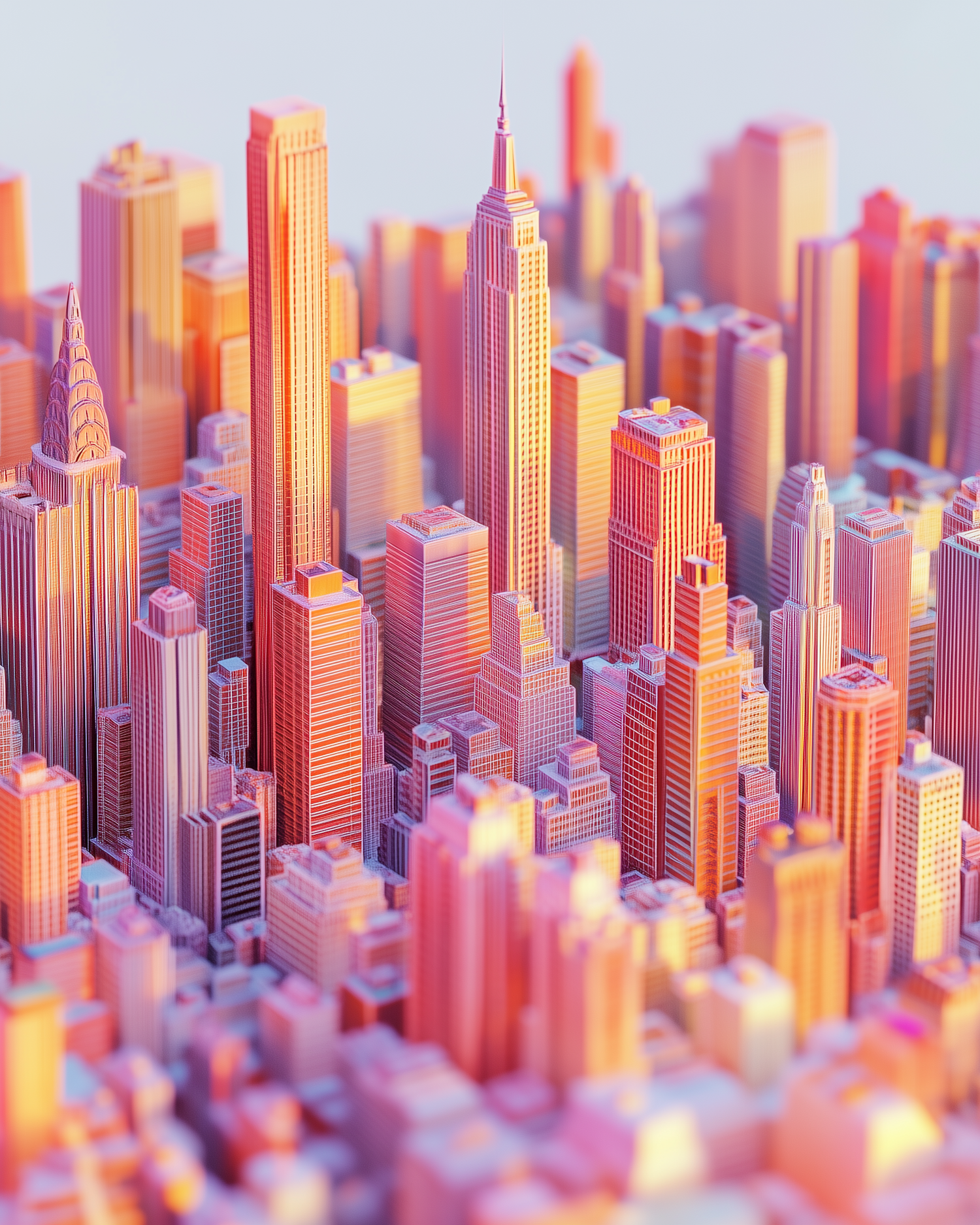 Stylized 3D cityscape with iconic skyscrapers in warm pink and orange hues, evoking a dreamy sunrise or sunset vibe.