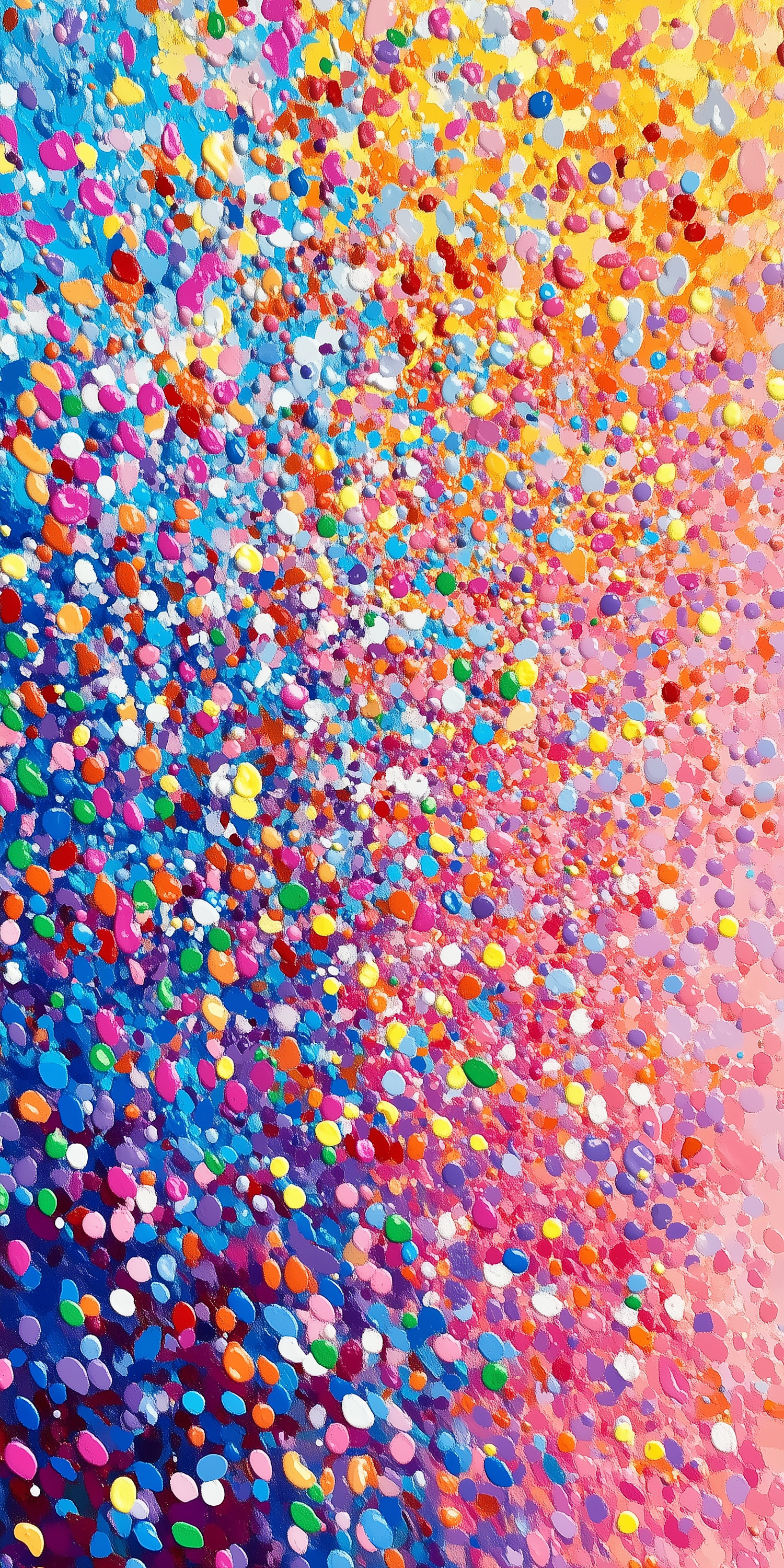 A colorful abstract painting with vibrant dots transitioning from warm yellows to cool blues, creating a dynamic and festive gradient effect.