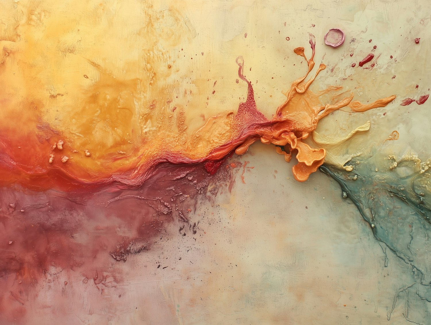 Dynamic abstract painting with vibrant red, orange, and yellow tones blending into green, featuring textured layers and splashes.