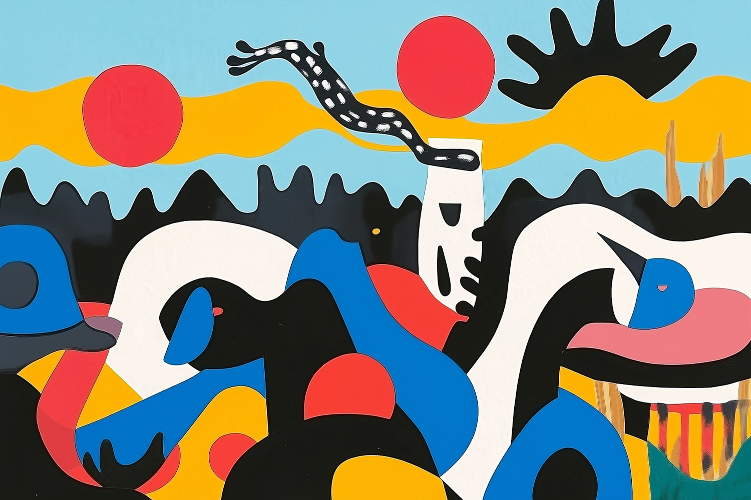 Vibrant abstract illustration with bold colors, dynamic shapes, and a playful composition featuring red, blue, yellow, and black elements.