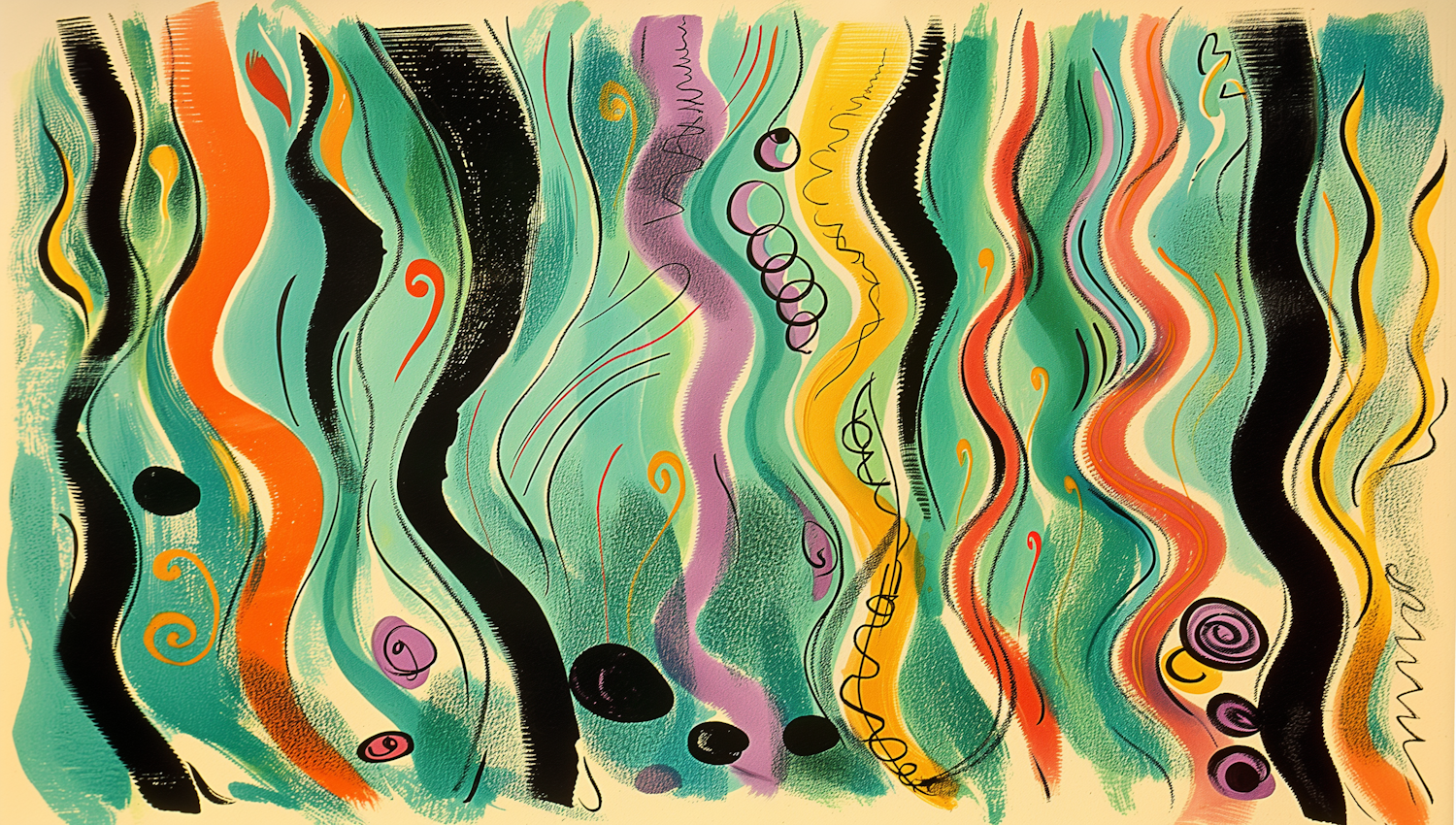 Vibrant abstract painting with swirling lines in teal, orange, black, and purple on a beige background, creating dynamic movement.