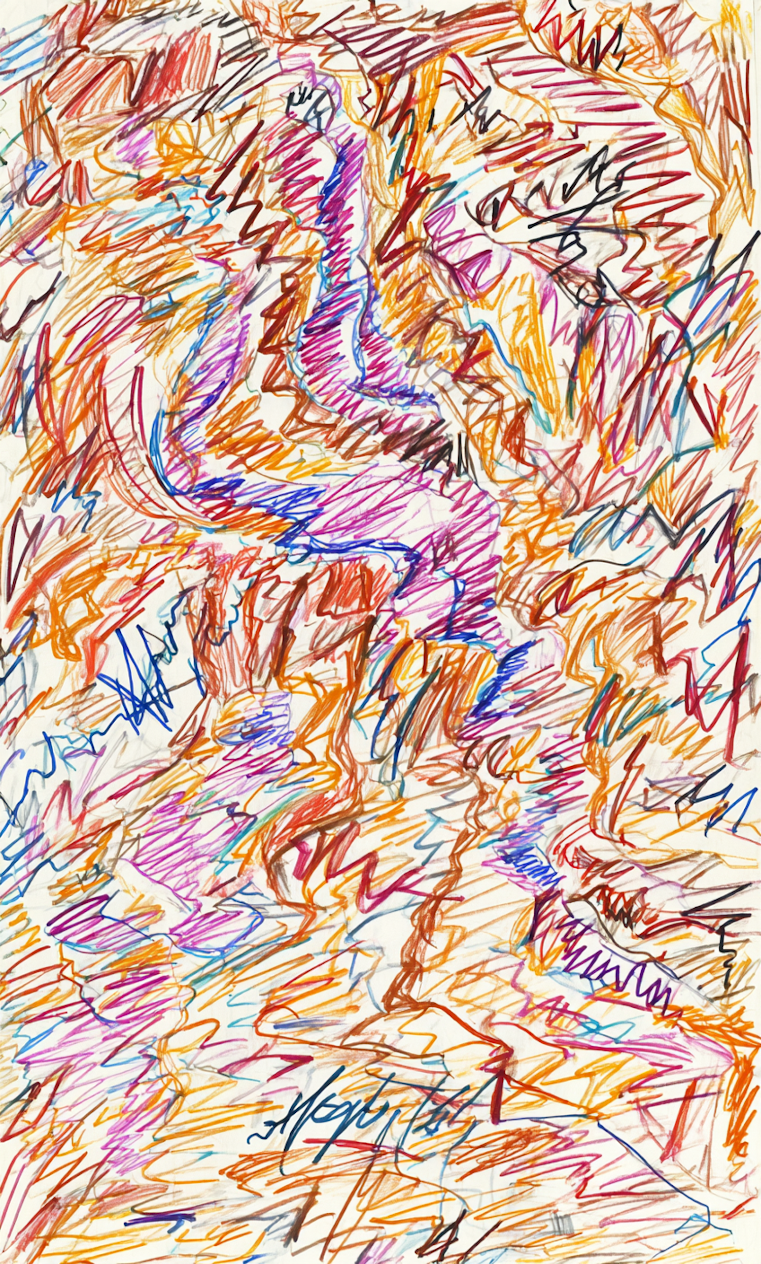 Abstract artwork with vibrant, dynamic strokes in red, orange, blue, and purple, creating a chaotic yet harmonious composition.