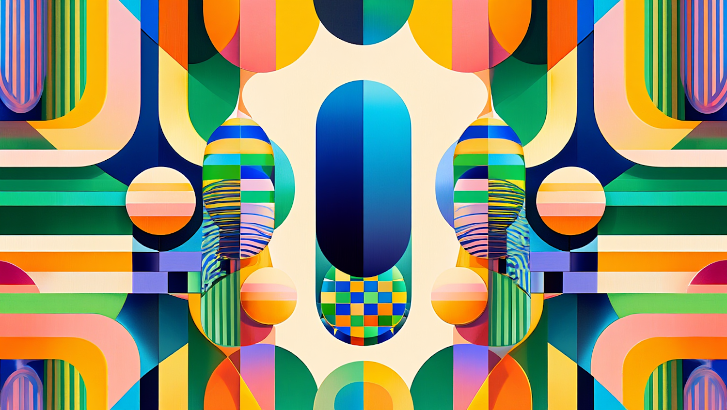 Colorful abstract geometric artwork with bold shapes, vibrant hues, and a symmetrical design. Perfect for modern art enthusiasts.