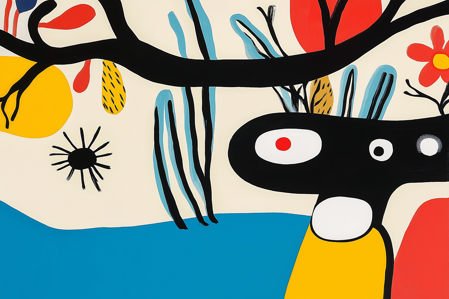 Colorful abstract illustration with bold shapes and vibrant hues, featuring black branches, red and yellow accents, and blue wavy lines.