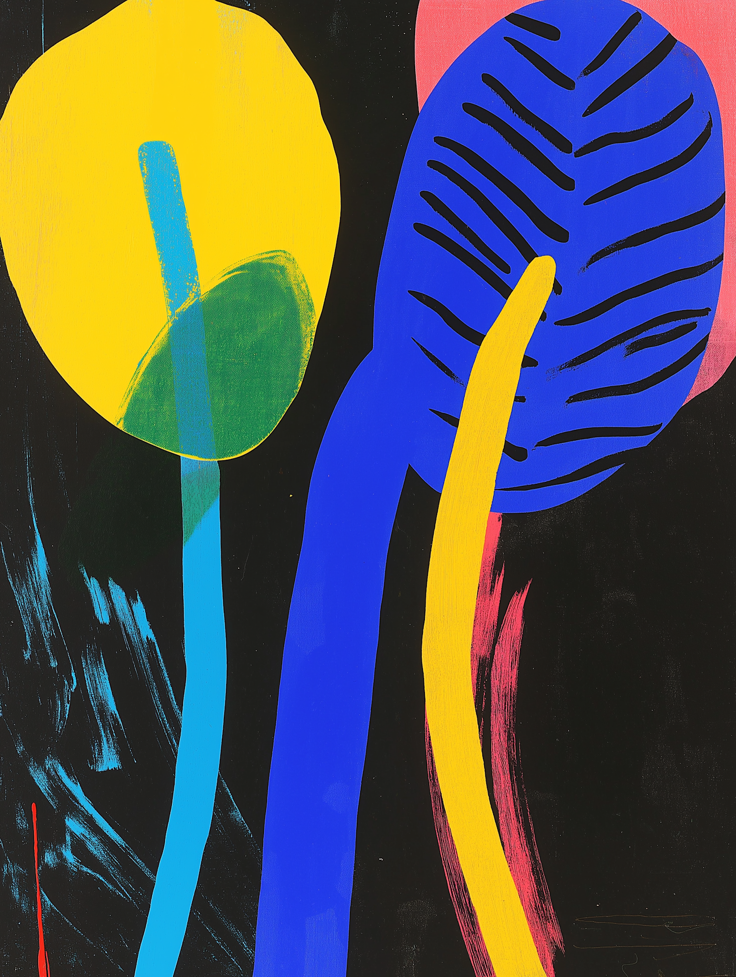 Bold abstract art with vibrant yellow, blue, and red shapes on a black background. Striking lines and textures create dynamic movement.