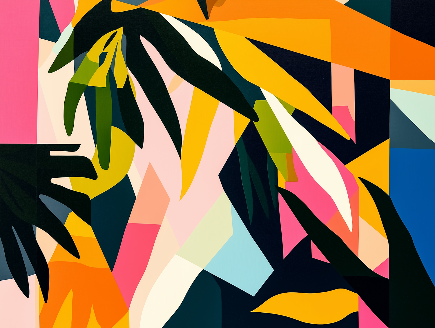 Colorful abstract artwork with bold geometric shapes, organic leaf forms, and vibrant shades of orange, green, pink, and blue.