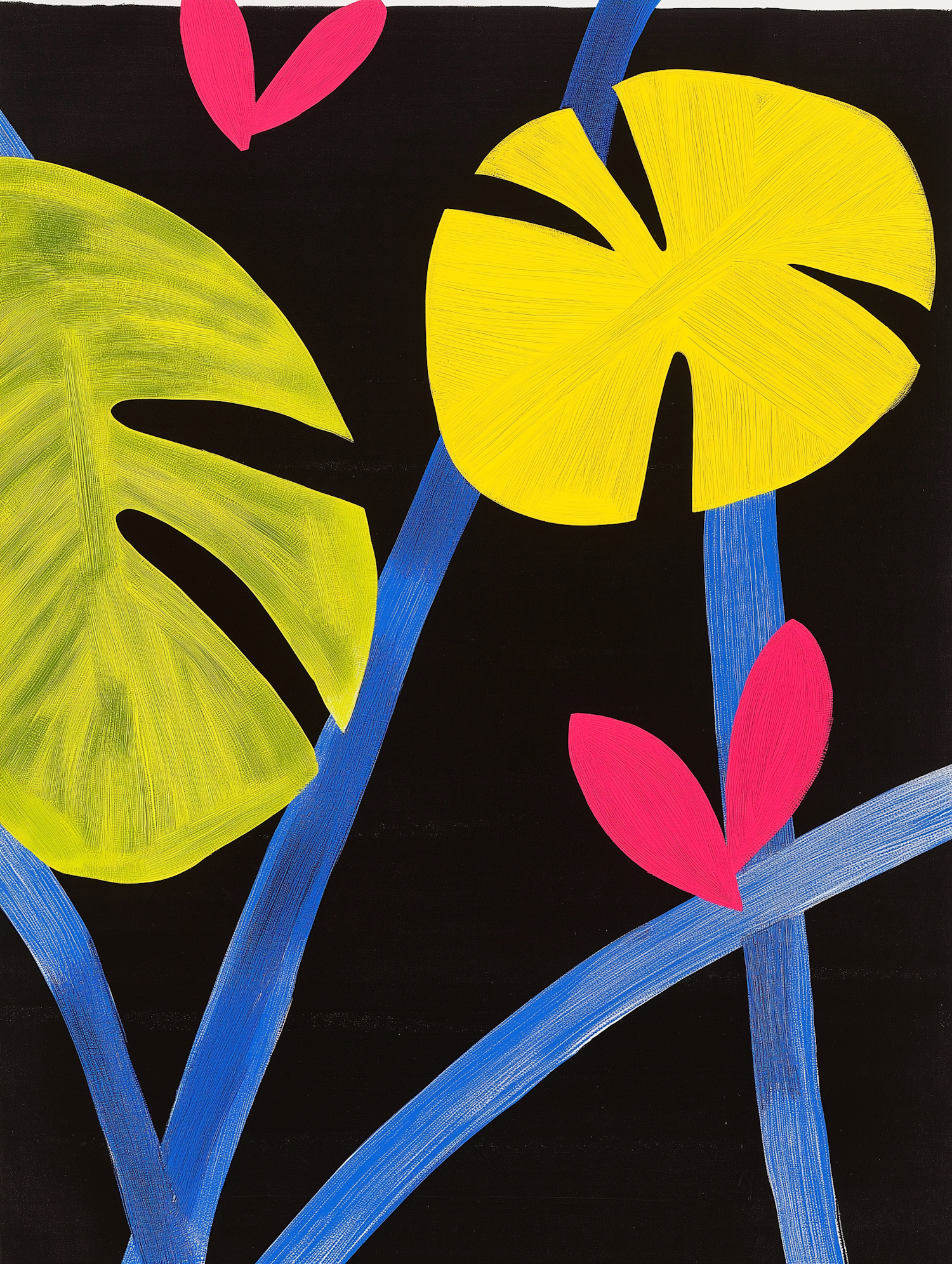 Bold abstract art with yellow and green leaves, blue lines, and red accents on a black background. A vibrant and modern composition.
