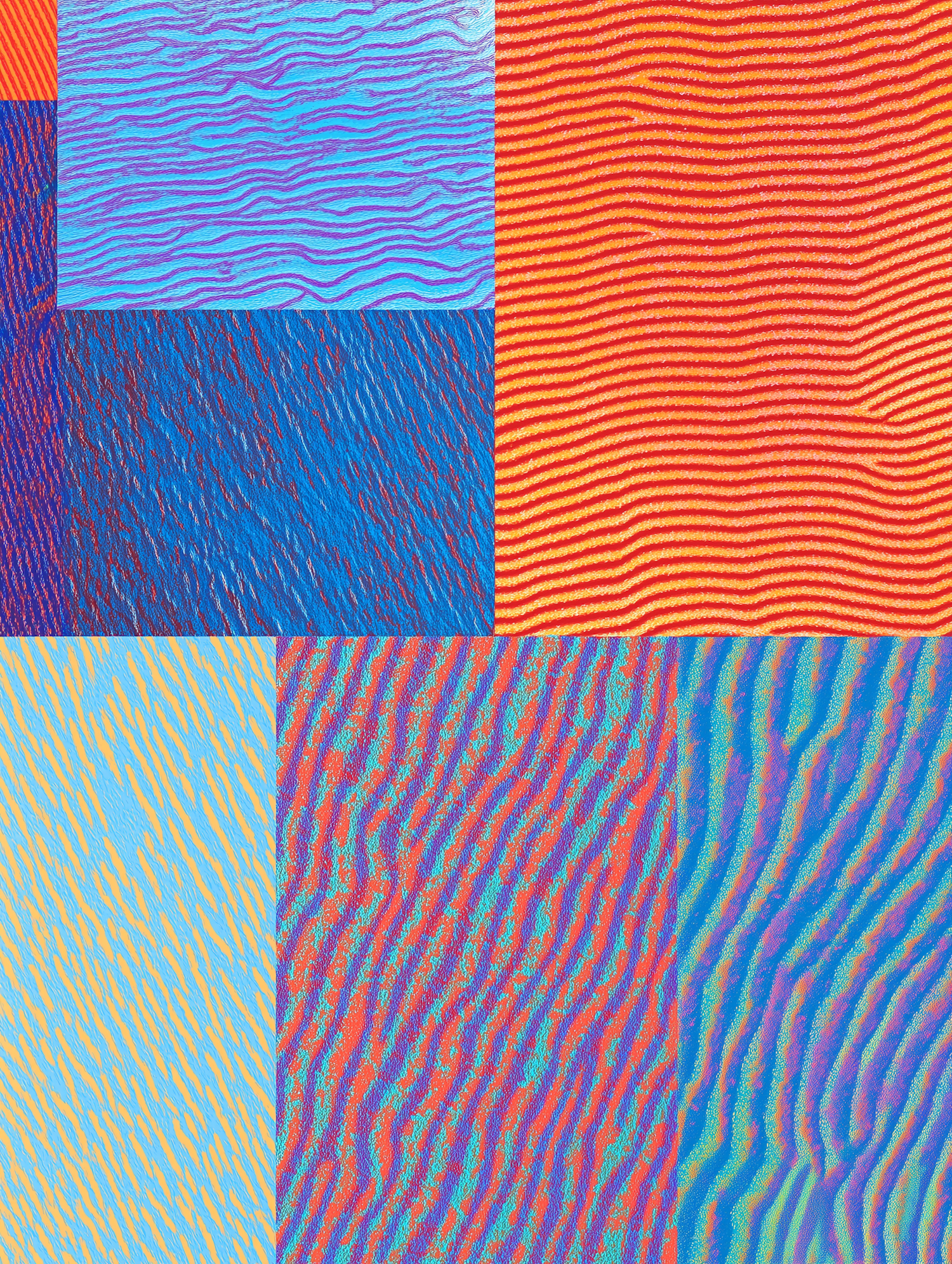 Colorful abstract collage with wavy patterns in blue, orange, and purple hues, creating a dynamic and vibrant visual experience.