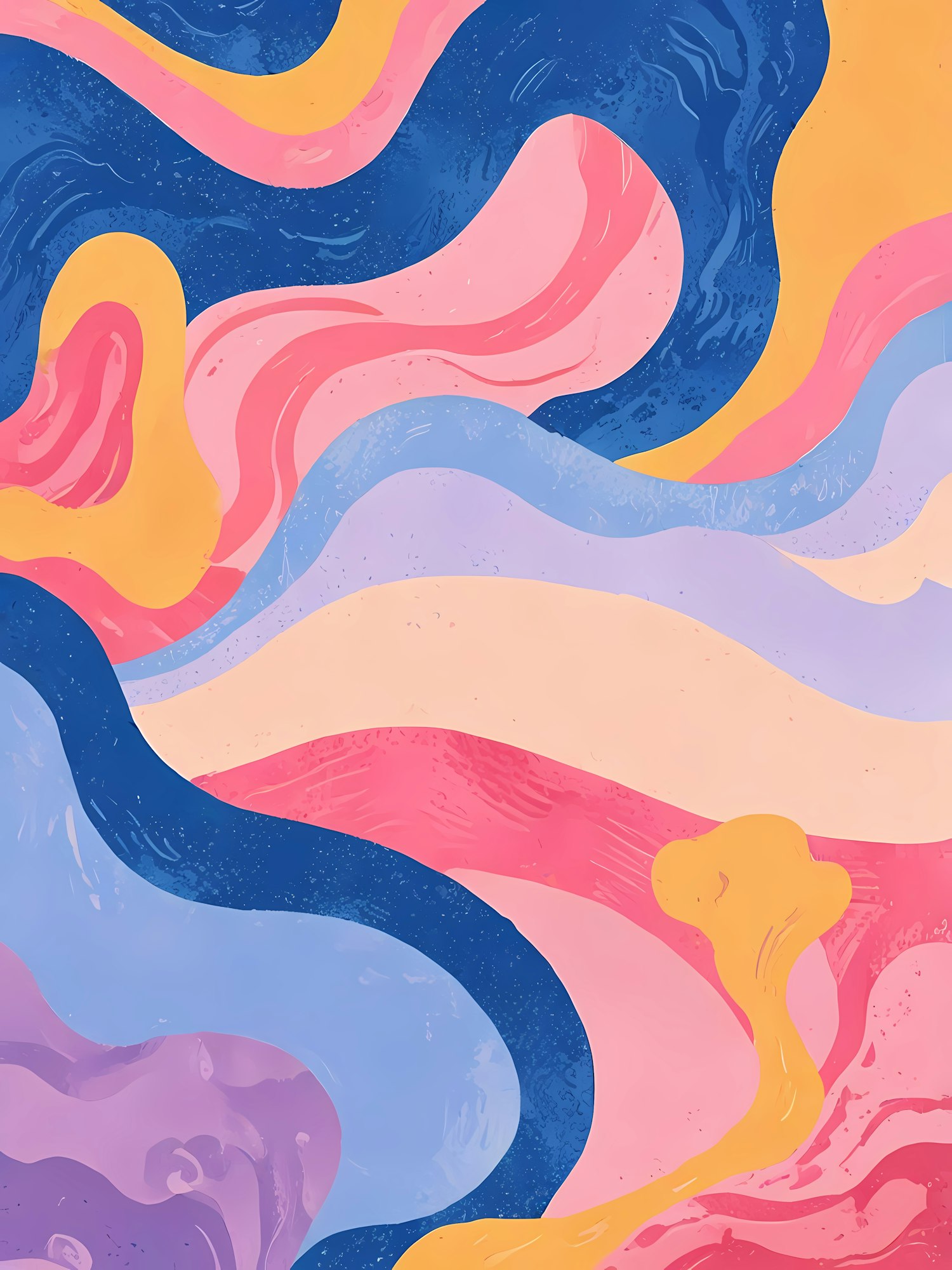 Colorful abstract illustration with flowing wavy lines in blue, pink, yellow, and lavender, creating a dynamic and fluid composition.