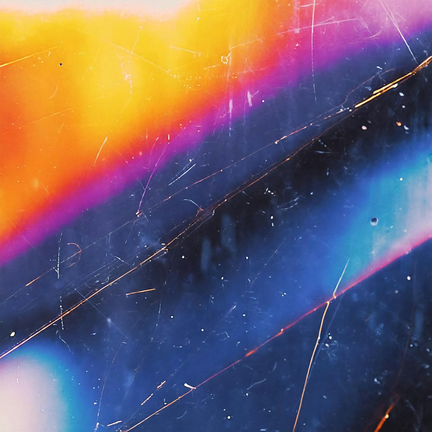 Vibrant abstract art with dynamic orange, purple, and blue hues, featuring textured scratches and intersecting lines.