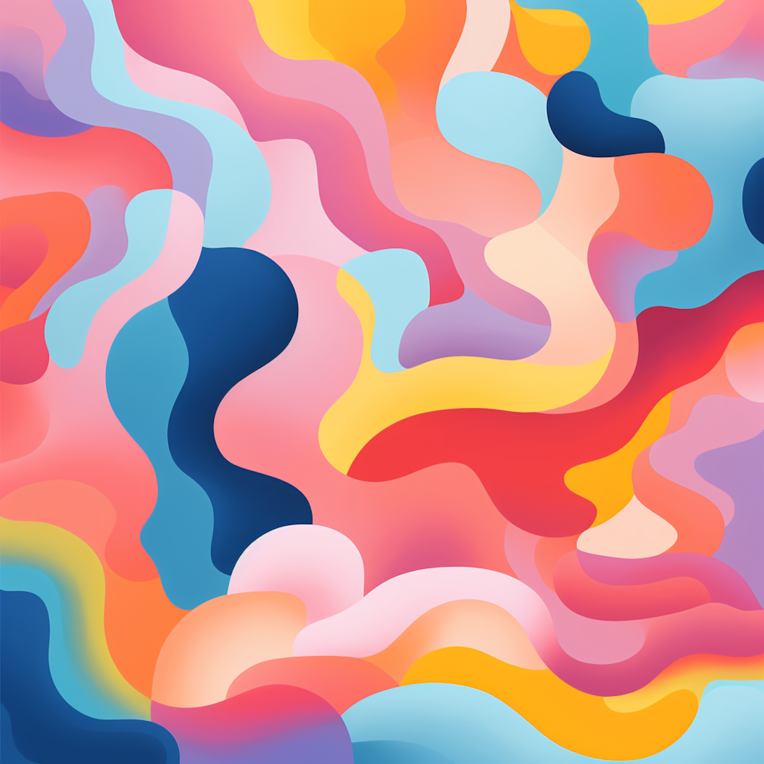 Vibrant abstract illustration with swirling shapes in pink, orange, yellow, blue, and purple, creating a dynamic and fluid composition.