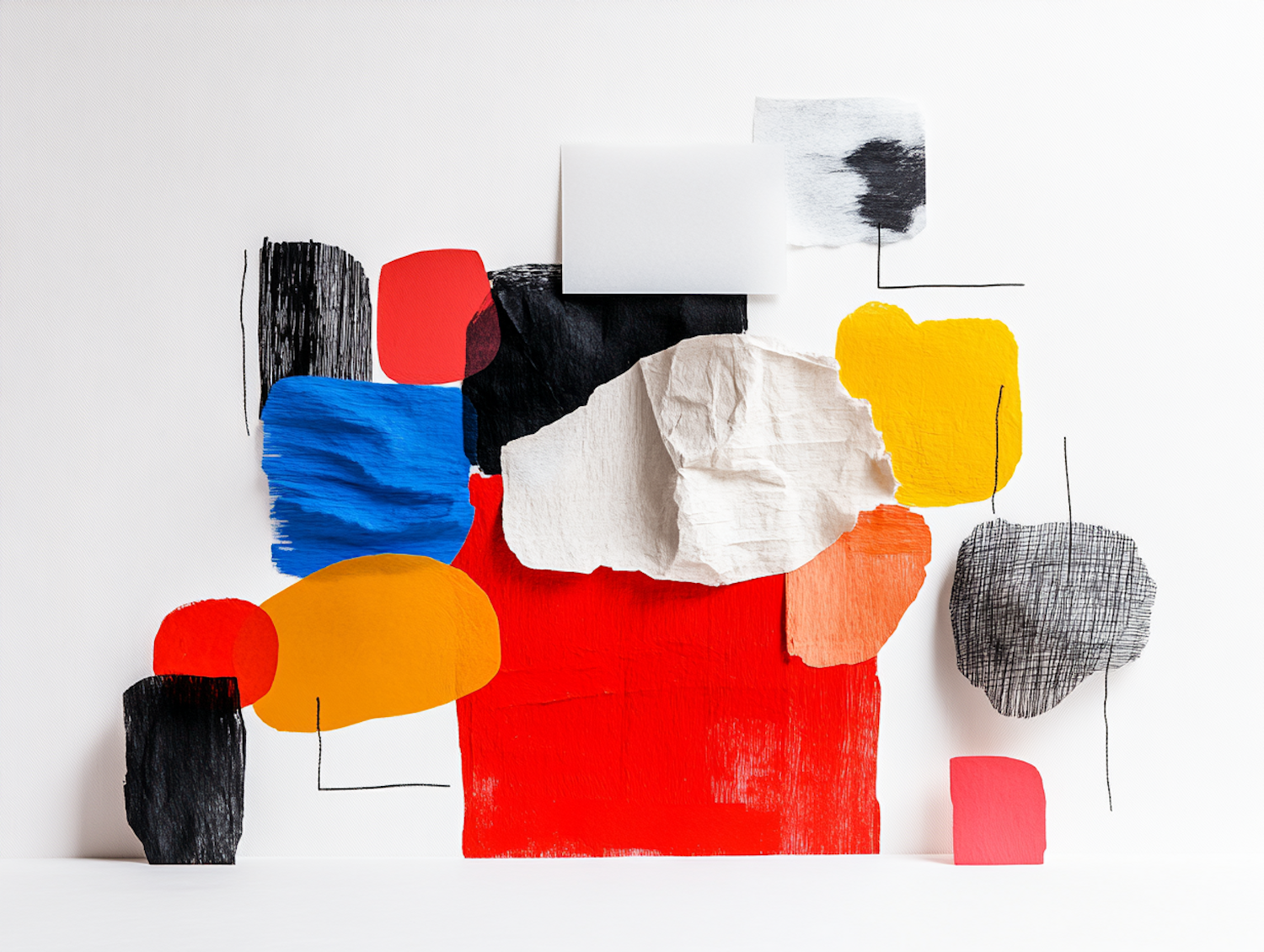 Abstract collage with vibrant colors and textures on a white background, featuring red, blue, yellow, and black paper pieces.