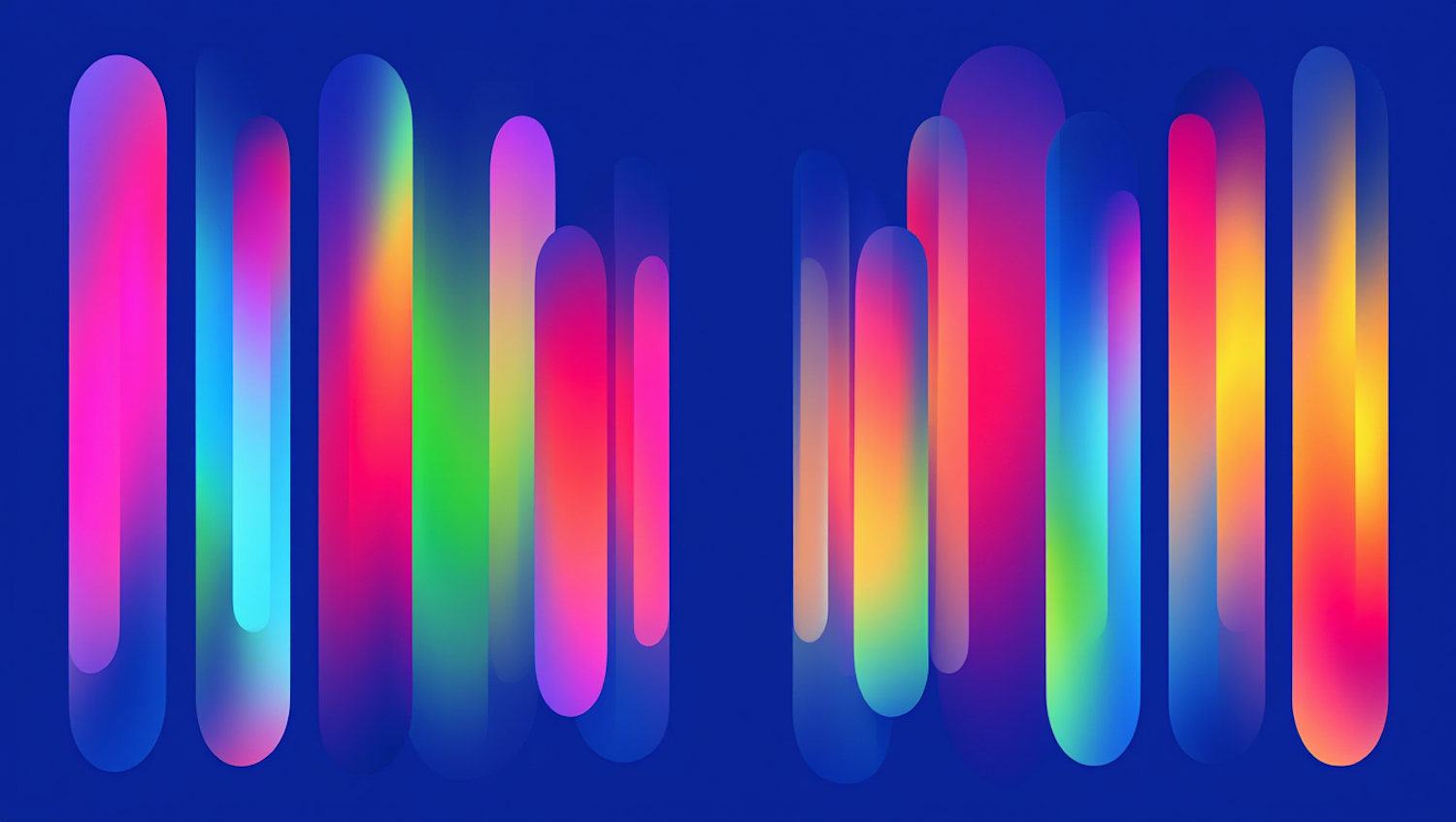 Vibrant abstract design with glowing gradient shapes on a deep blue background, blending neon colors like pink, green, and yellow.