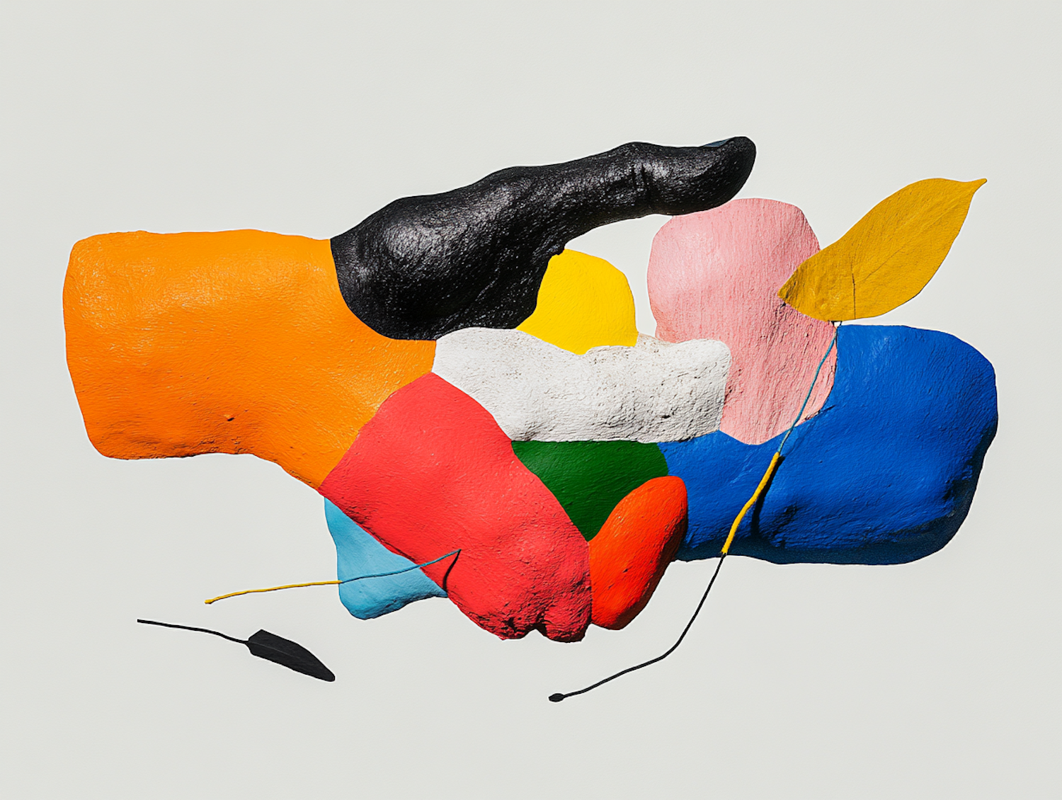 Colorful abstract artwork with geometric shapes and textures, featuring a black hand-like form and vibrant colors on a light gray background.