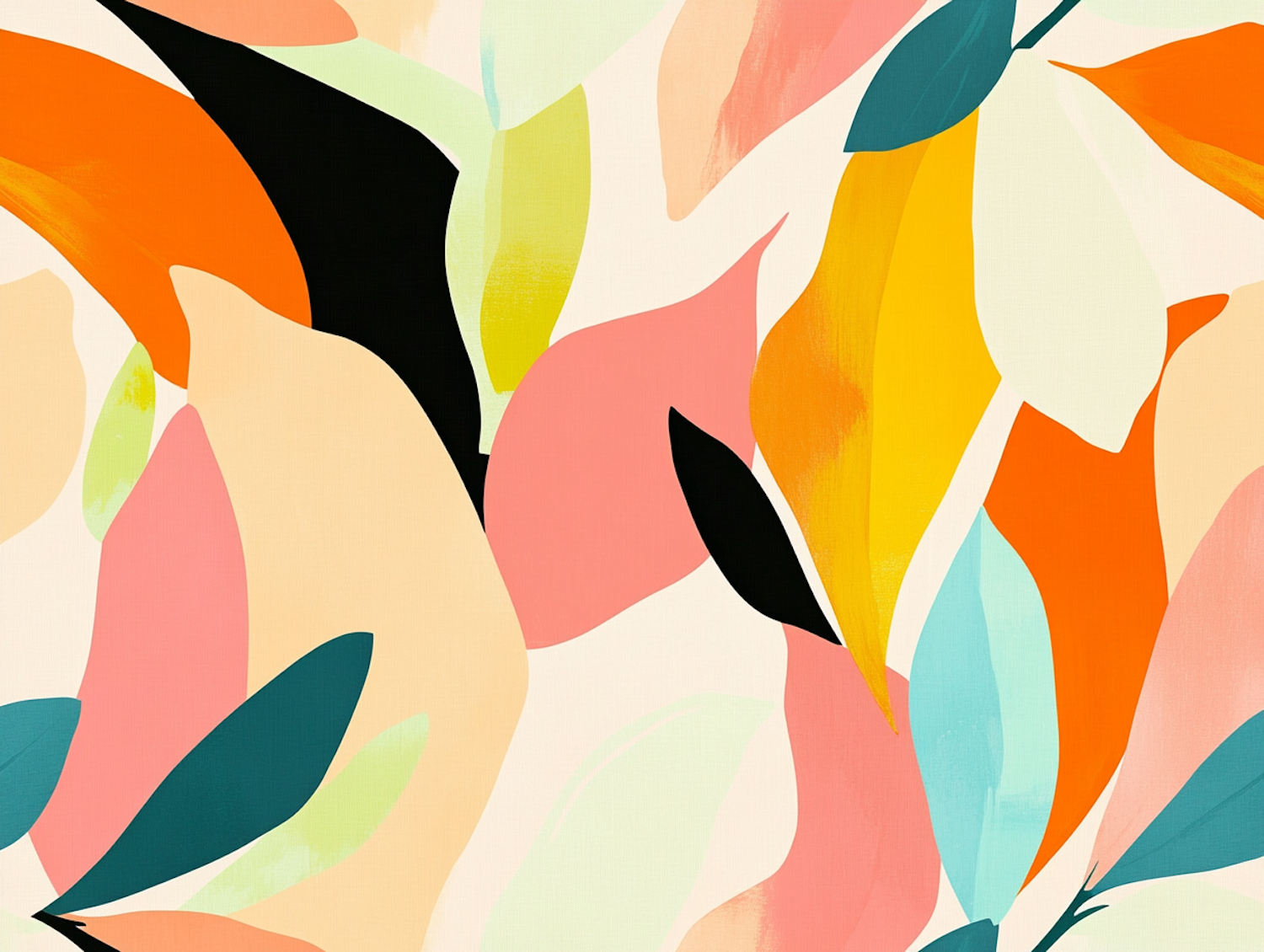 Bright abstract illustration with colorful leaf-like shapes in orange, yellow, pink, teal, and black on an off-white background.