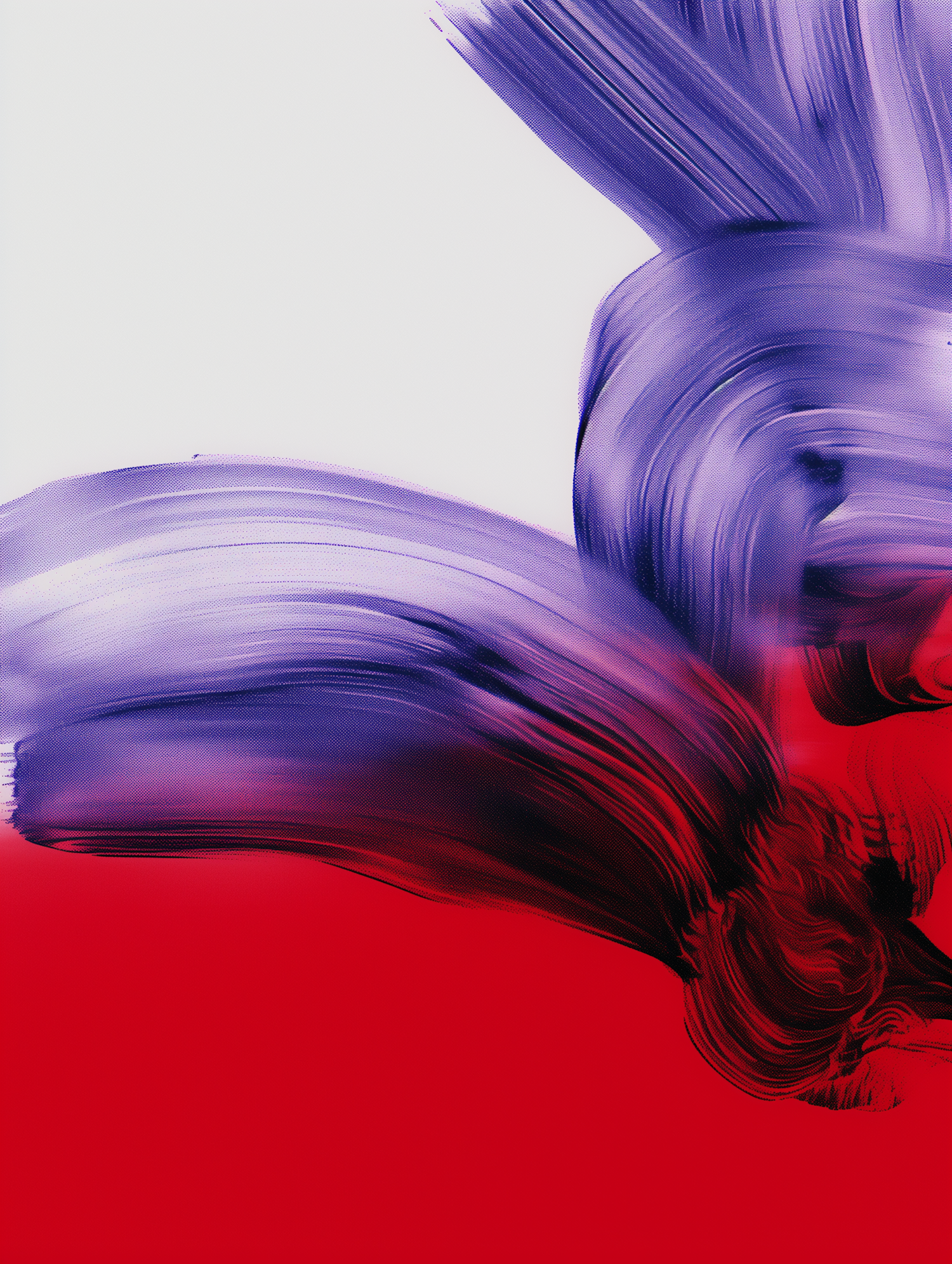 Abstract art with bold purple brushstrokes over a vivid red and white background, creating a dynamic and energetic composition.