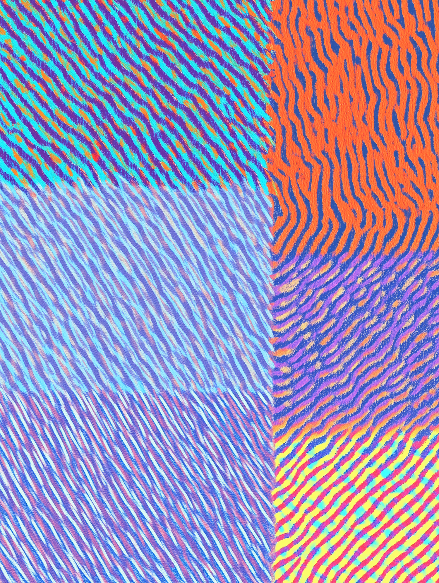 Vibrant abstract artwork with wavy striped patterns in blue, orange, and purple hues, divided into four dynamic quadrants.