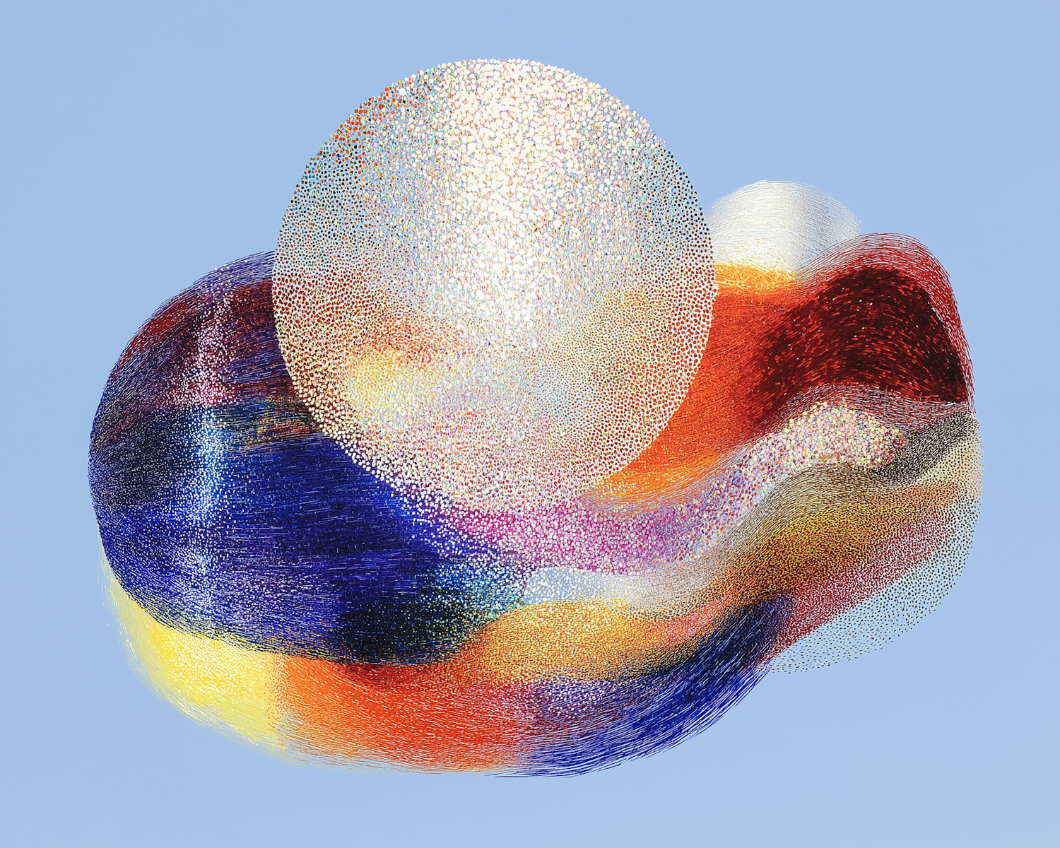 A colorful abstract artwork with a shimmering sphere and flowing waves of vibrant hues against a light blue background.