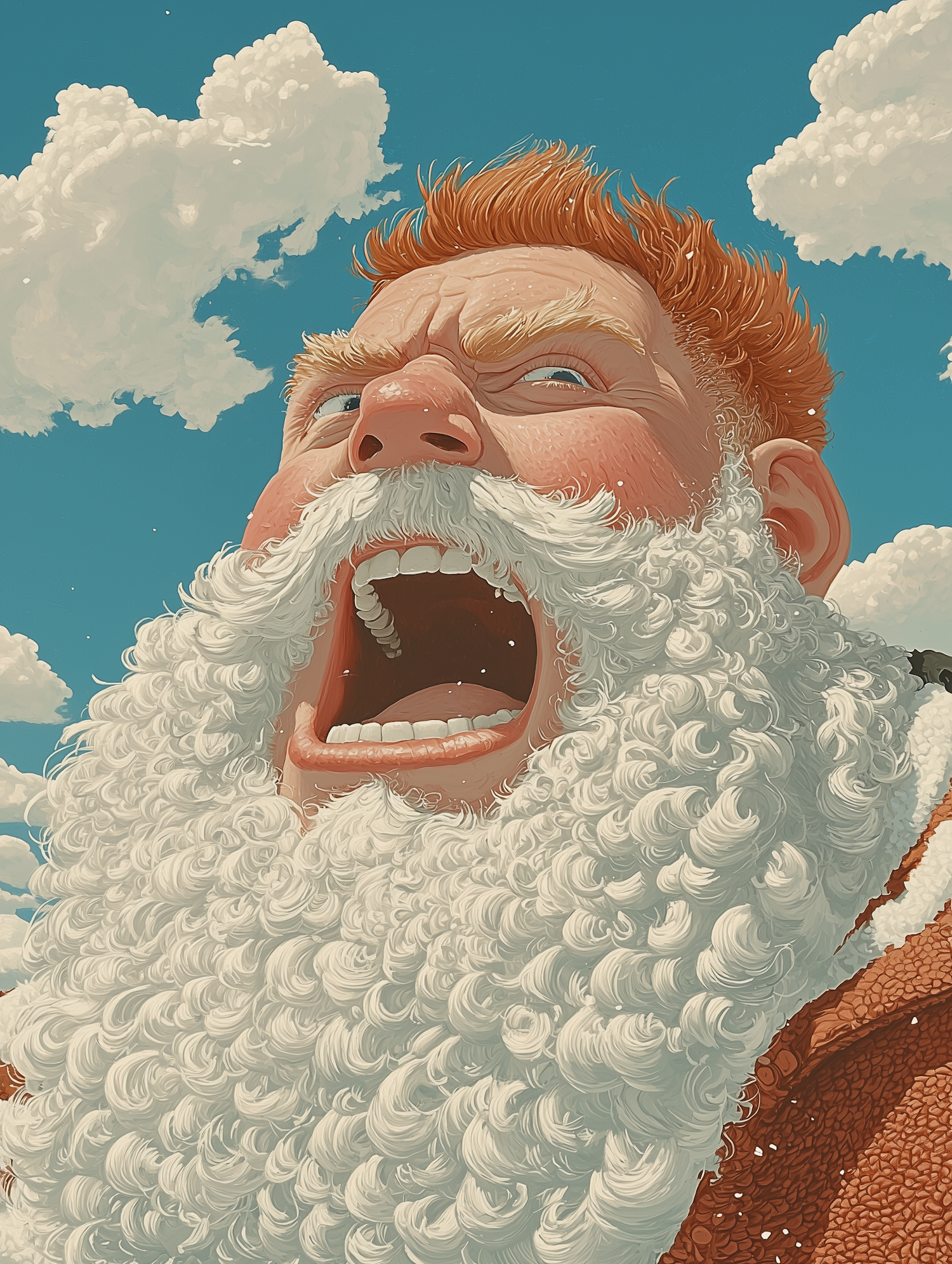 Dynamic illustration of a man with a large white beard and red hair, shouting against a blue sky with clouds.