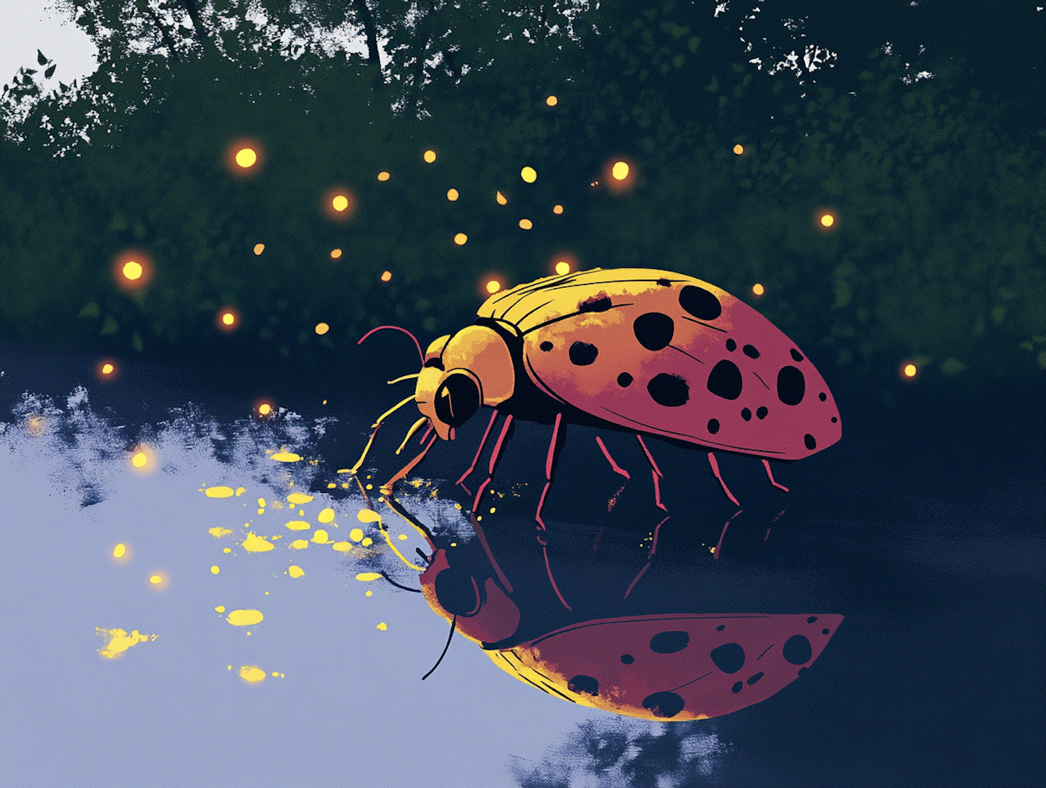 A colorful beetle with black spots near a reflective water surface, surrounded by glowing orbs in a dark, lush forest setting.