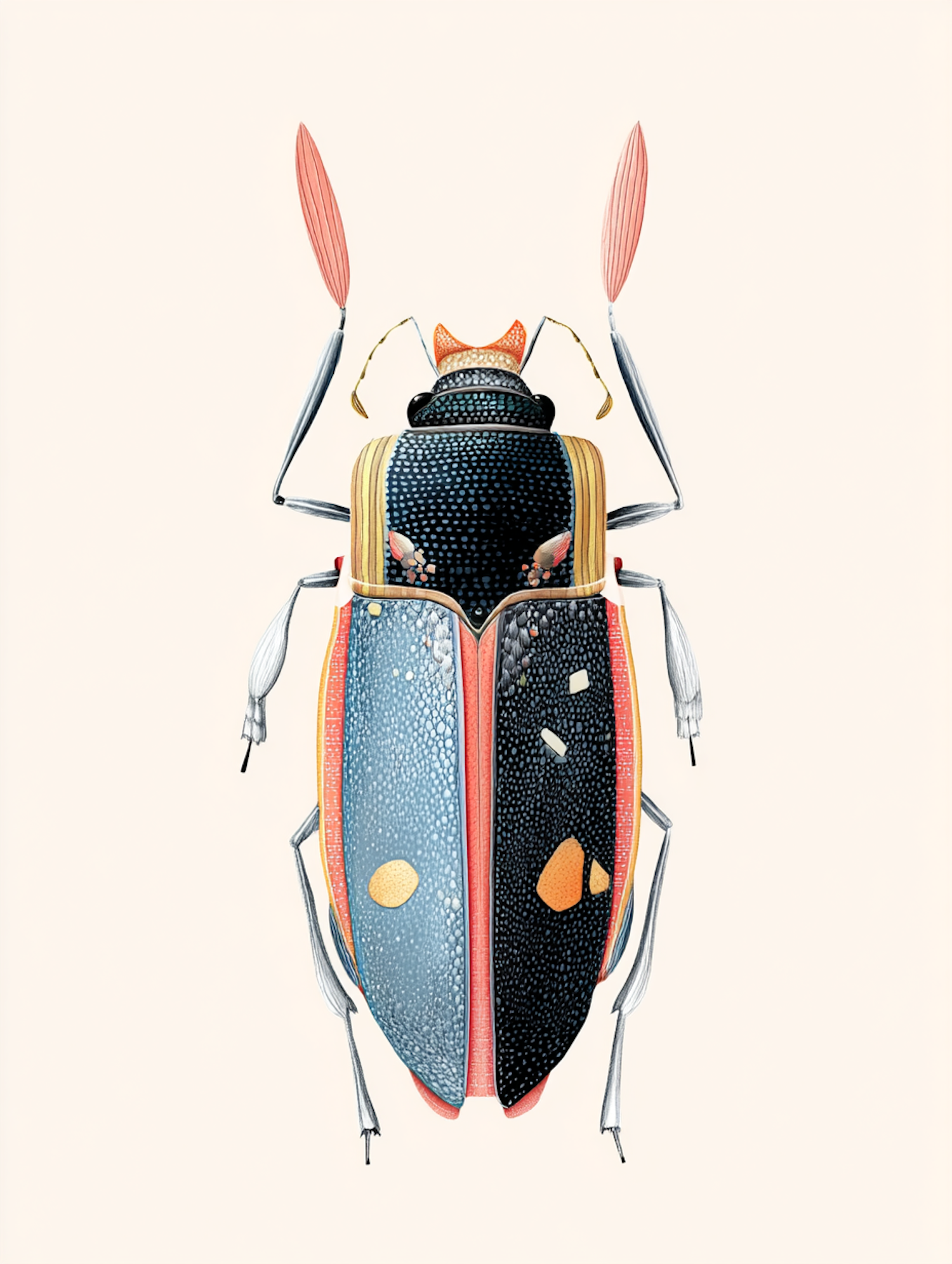 Detailed illustration of a colorful beetle with blue and black wings, yellow and orange spots, and pink antennae on a beige background.