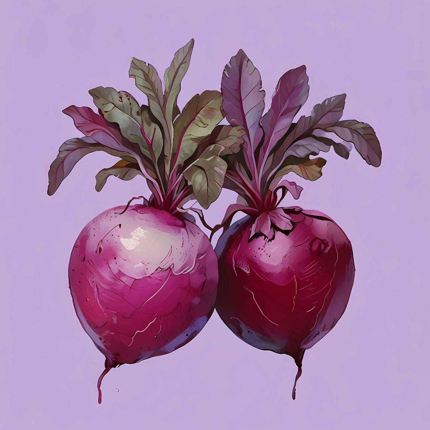 Illustration of two vibrant beetroots with lush leaves against a soft purple background, showcasing rich colors and textures.