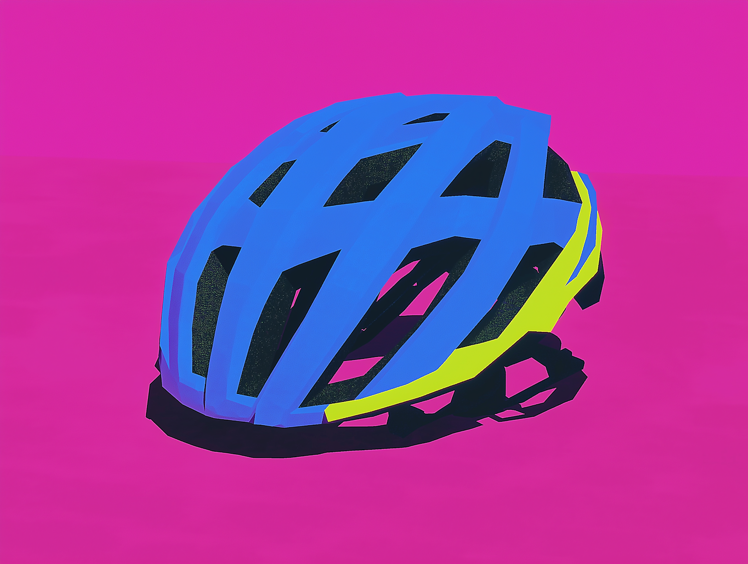 Bold cycling helmet illustration with blue, neon yellow, and black on a vivid magenta background. Modern, sleek, and eye-catching design.