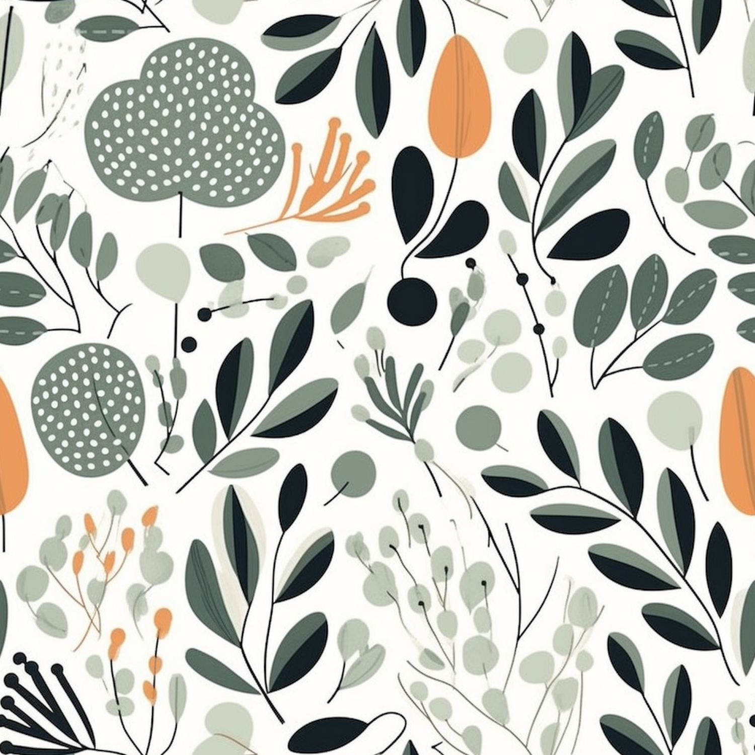 Seamless botanical pattern with green leaves and orange accents on an off-white background, creating a vibrant and intricate design.