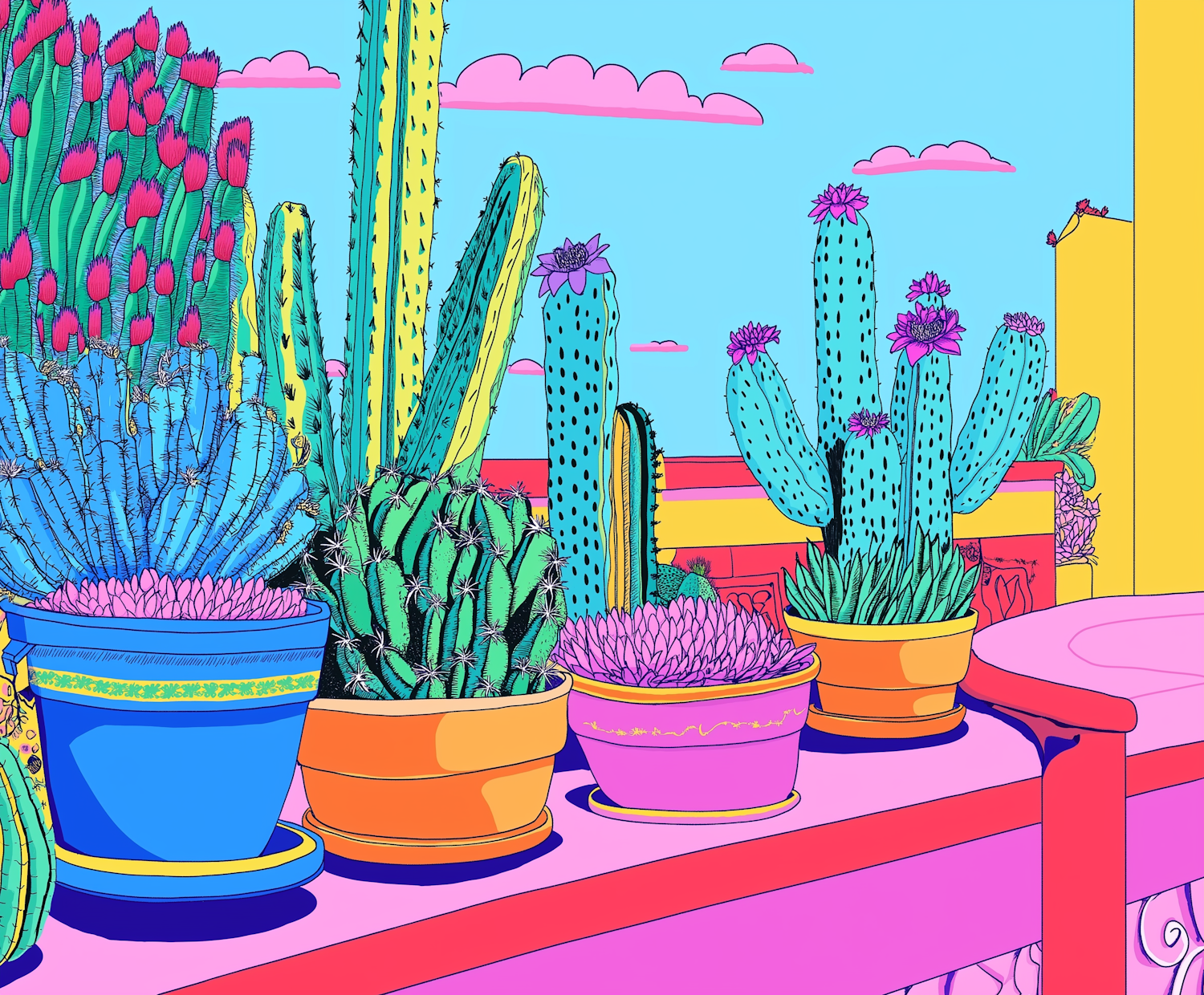 Colorful illustration of cacti in vibrant pots against a bright blue sky, featuring pink, blue, and green hues with whimsical details.