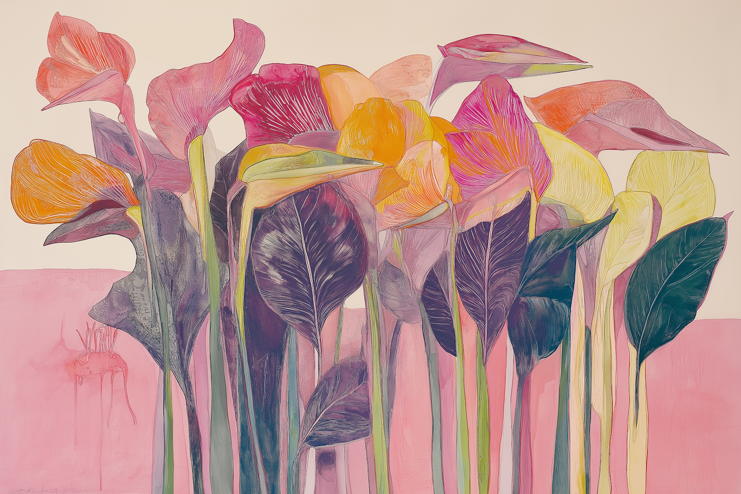 Colorful illustration of calla lilies with pink, orange, and yellow petals against a soft pink background.