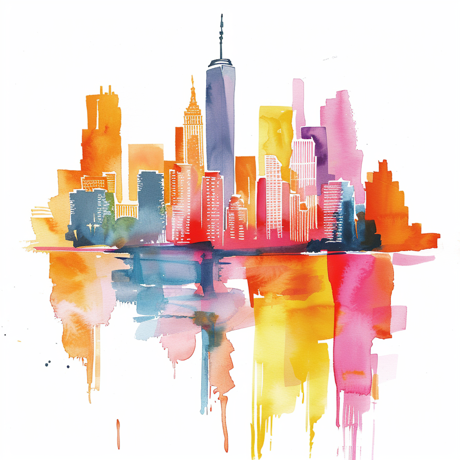 Colorful watercolor city skyline with vibrant reflections in blue and purple hues, blending into a dreamy artistic composition.