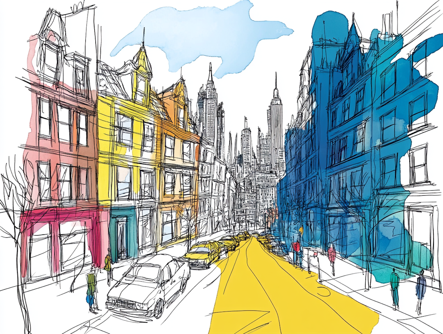 Colorful city street illustration with vibrant buildings, a yellow road, and a lively urban vibe. Perfect for modern art and cityscape lovers.