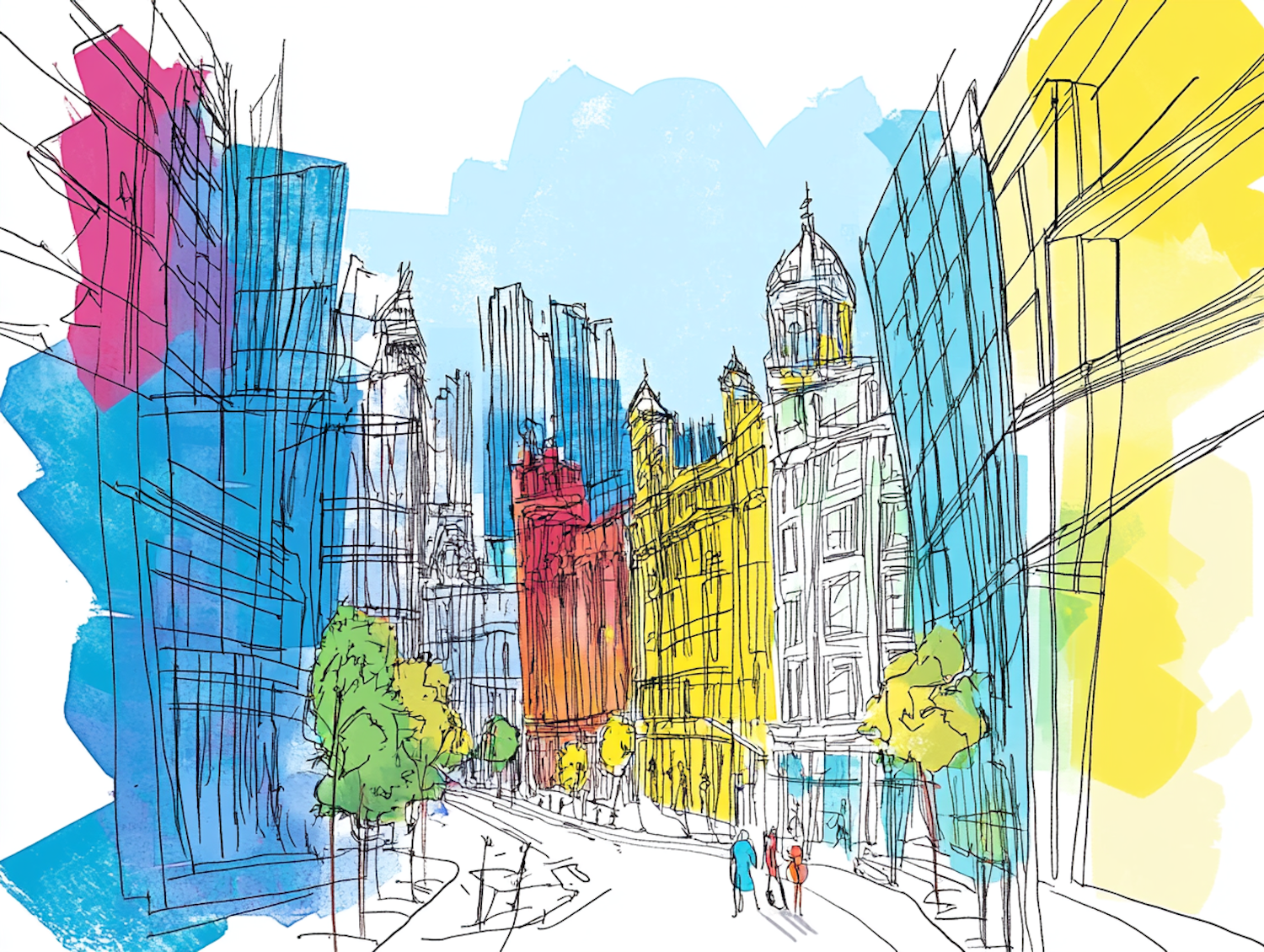 Colorful cityscape illustration with modern and classical buildings, vibrant splashes of color, and people walking along a tree-lined street.