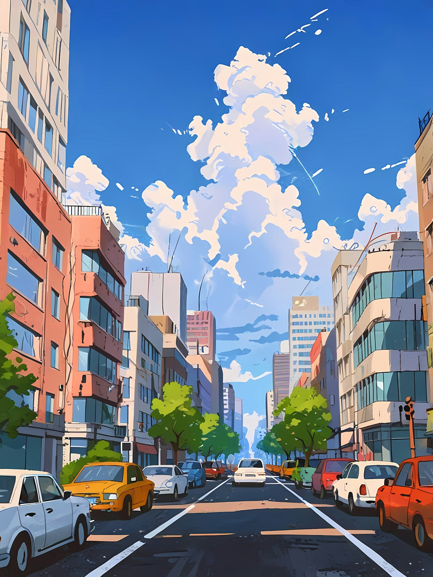 Vibrant city street with diverse architecture, colorful cars, and lush trees under a bright blue sky with fluffy clouds.