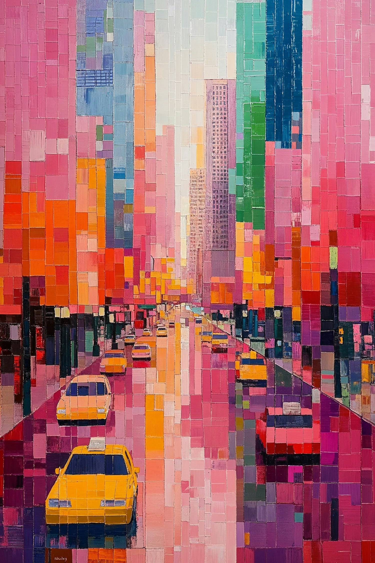 Colorful mosaic cityscape with yellow taxis and vibrant buildings in pink, orange, and blue hues, creating a lively urban scene.
