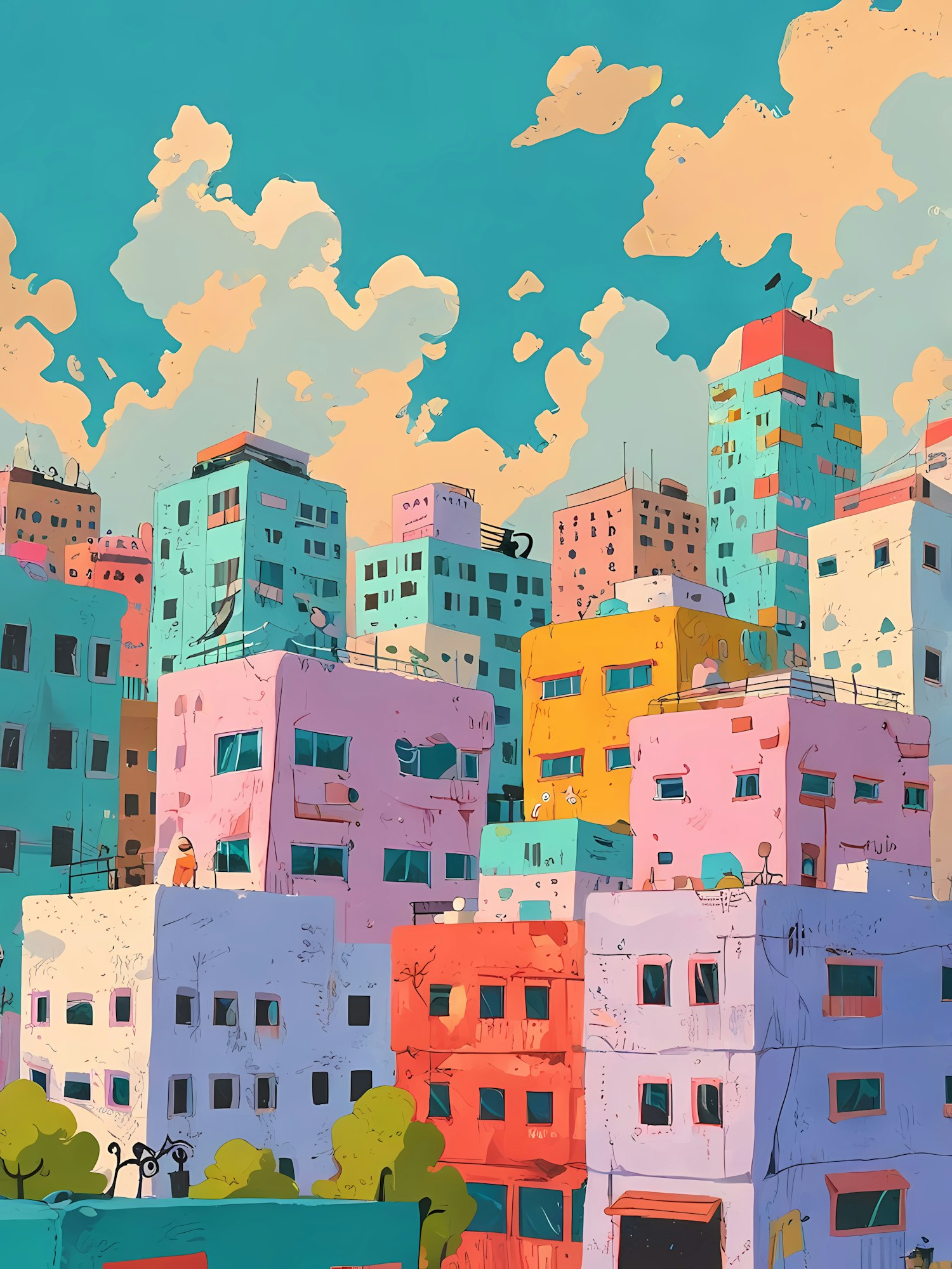 Colorful cityscape illustration with pastel buildings and a bright sky, creating a whimsical urban scene.