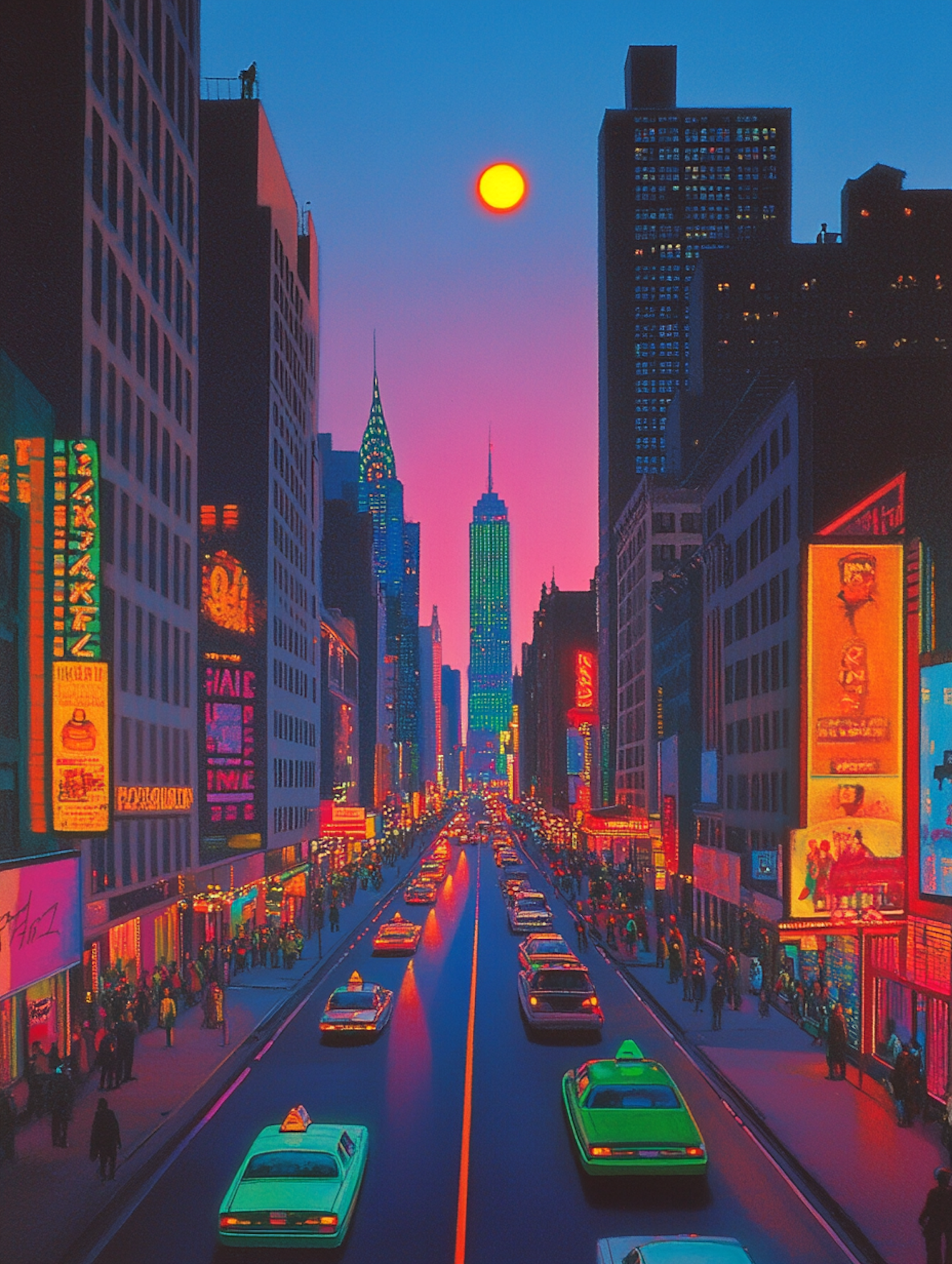 Vibrant cityscape at dusk with neon lights, taxis, and iconic skyscrapers under a colorful sunset sky.