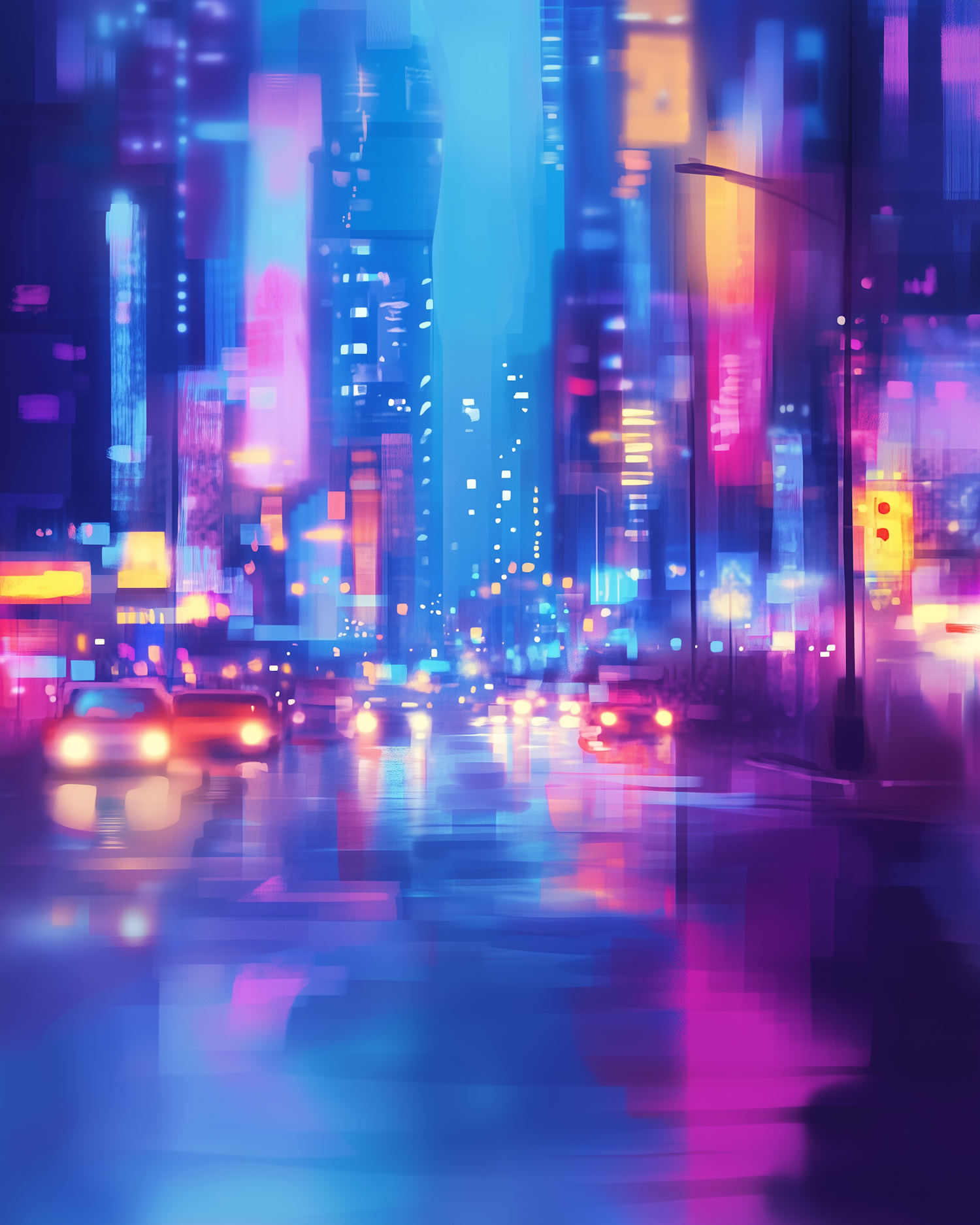 Vibrant cityscape at night with neon lights, colorful reflections, and bustling traffic, creating a lively urban atmosphere.