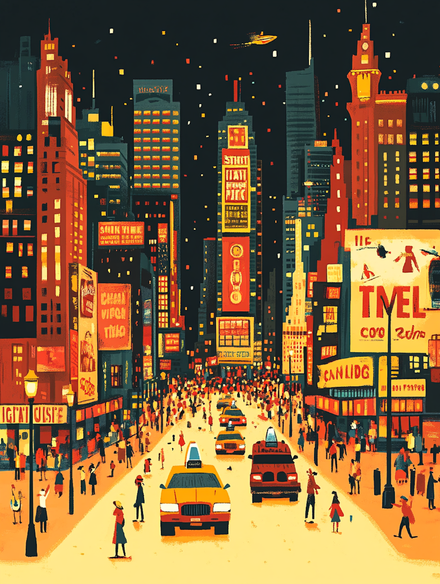 Vibrant city street illustration with bustling crowds, bright billboards, and yellow taxis under a starry night sky.