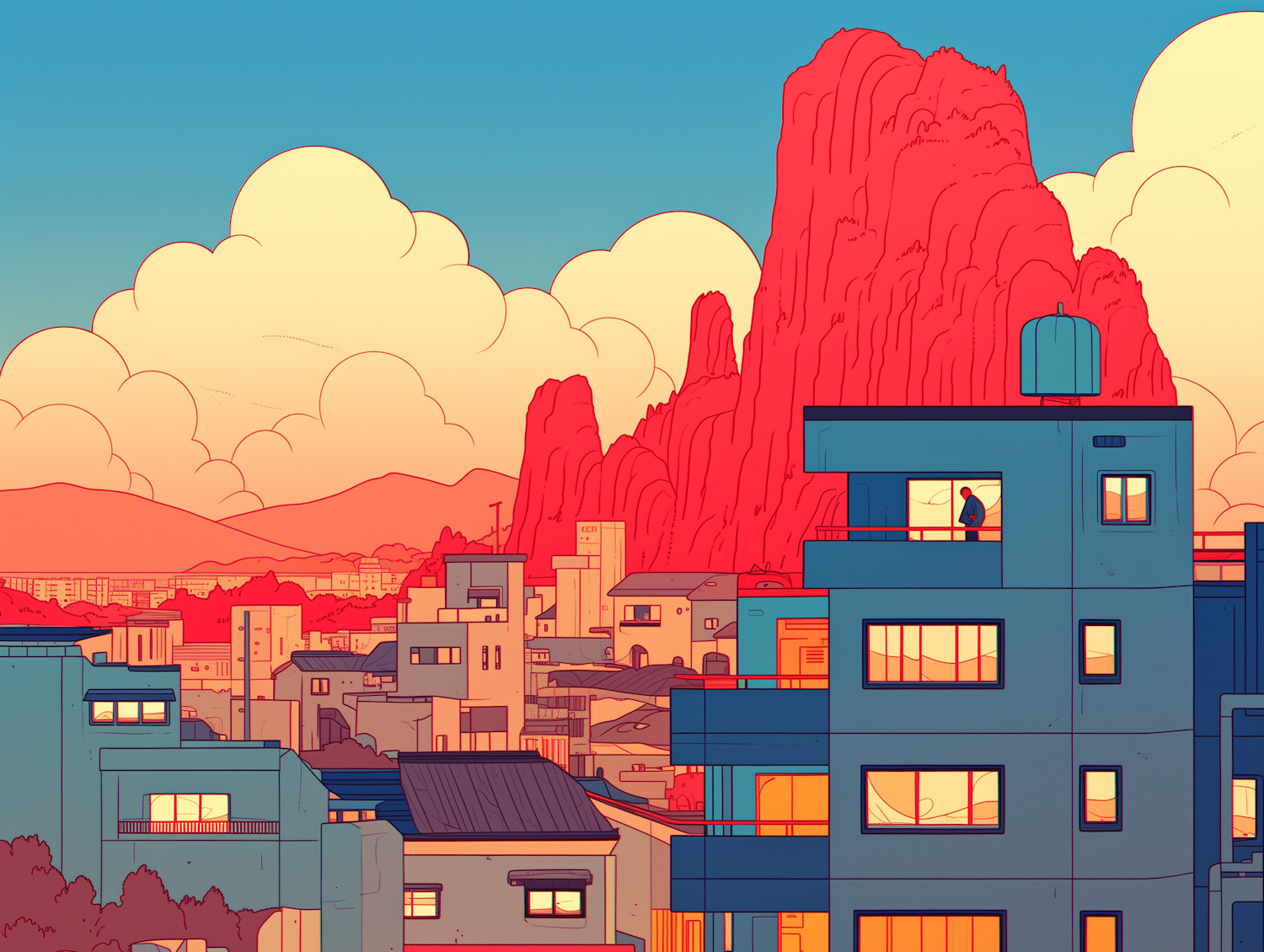 Vibrant cityscape illustration with blue buildings, red mountains, and a sunset sky. A lone figure stands on a balcony, adding depth.