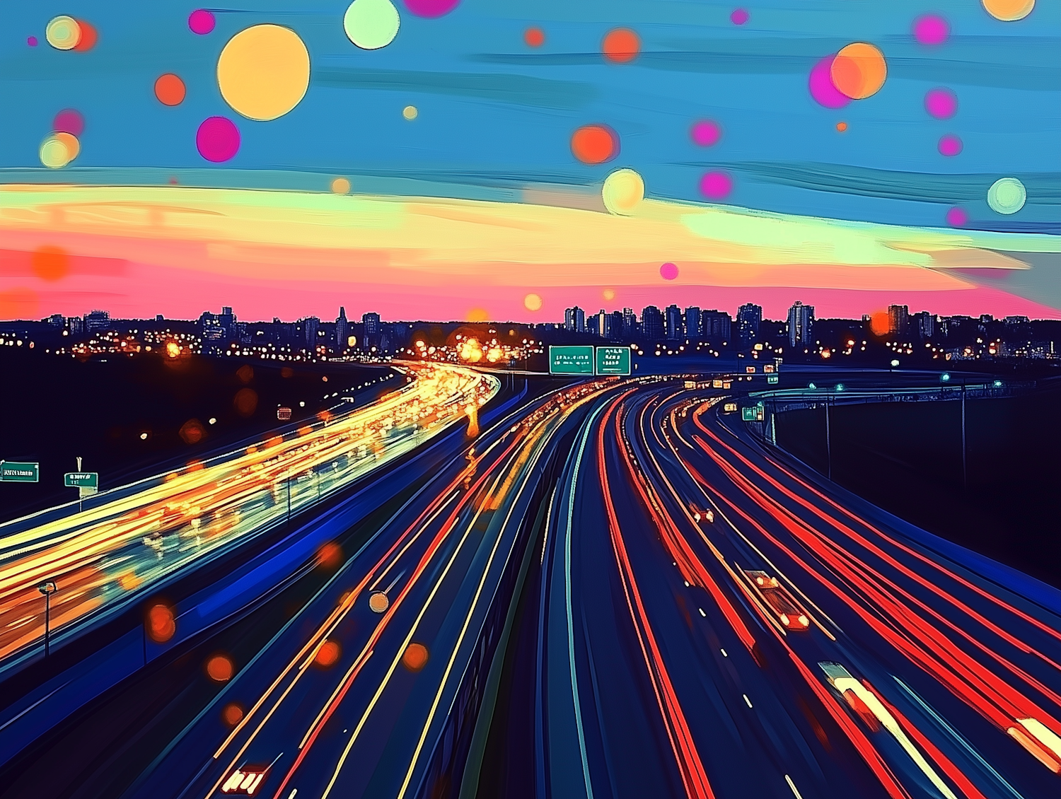 A colorful cityscape illustration with light trails on a highway, a glowing sunset, and whimsical floating orbs in the sky.