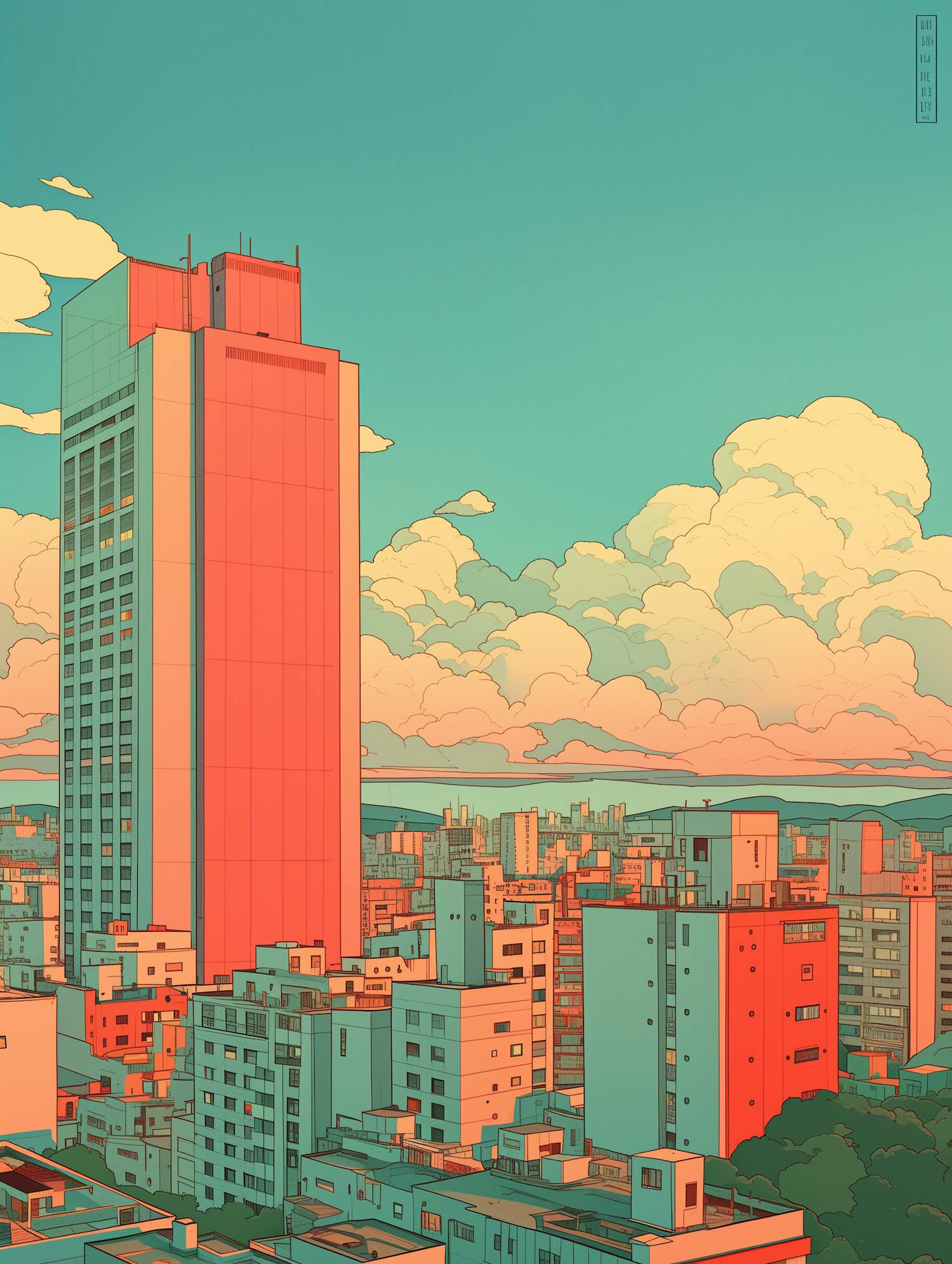 Vibrant cityscape illustration with a tall red-orange building, teal sky, and pastel structures. Bold colors create a modern, artistic vibe.