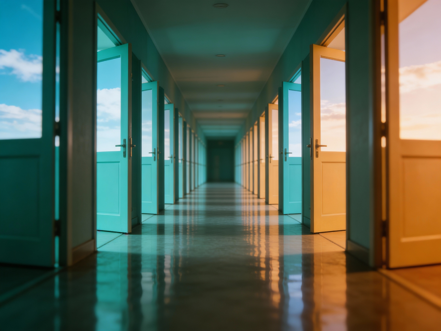 A corridor with open teal and yellow doors revealing skies of blue and orange, creating a vibrant and symmetrical visual effect.