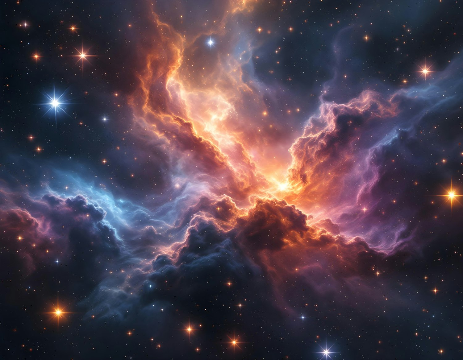 Stunning cosmic nebula with vibrant orange and blue clouds, surrounded by twinkling stars in a dark universe.