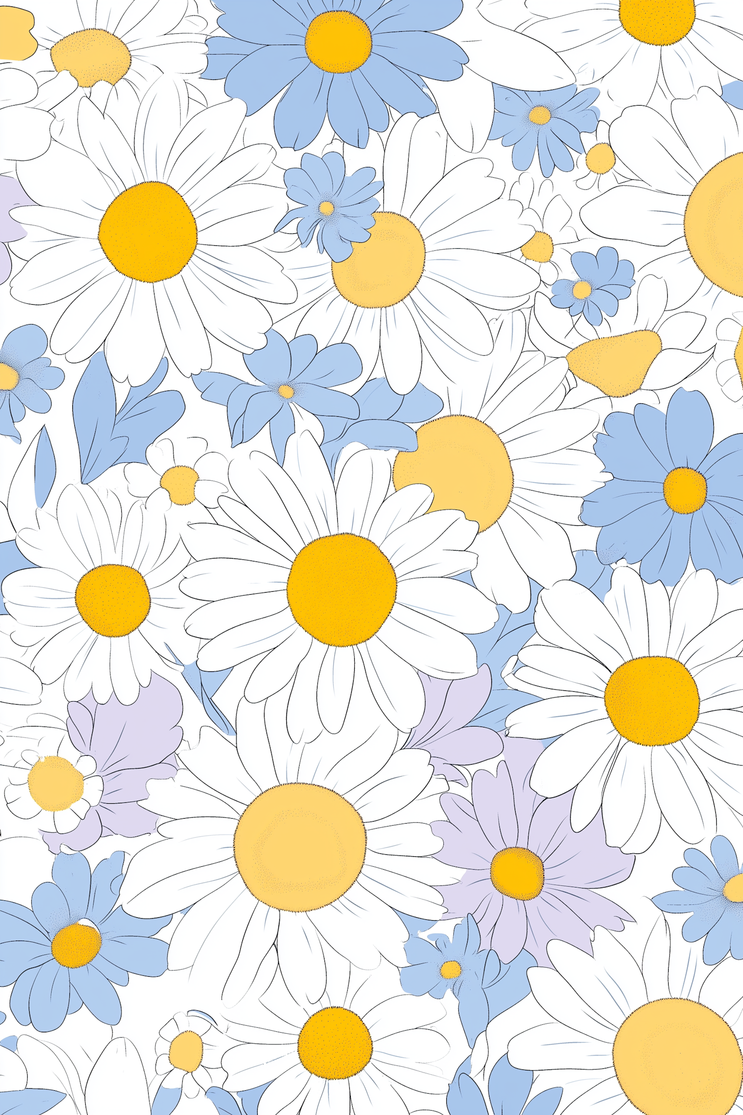 Colorful floral pattern with white daisies, yellow centers, and blue accents. Perfect for spring-themed designs and decor.