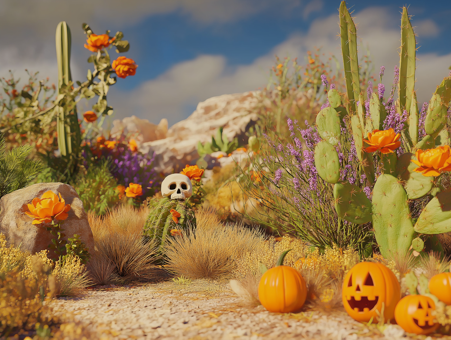 Desert scene with cacti, orange flowers, a skull, and pumpkins, including a jack-o'-lantern, under a partly cloudy sky.